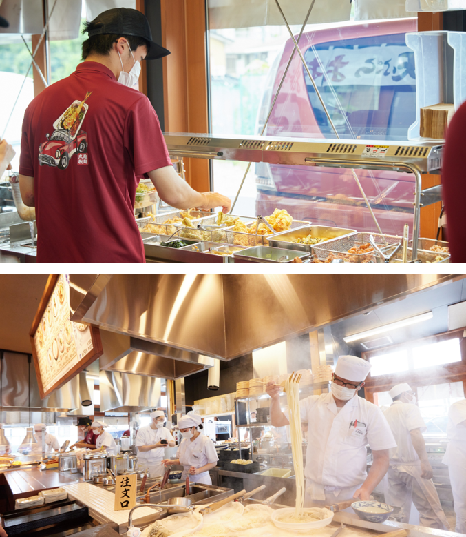 丸亀製麺 渋川店は、ドライブスルーのご注文であっても、お客さまに“楽しさ”や“わくわく”とした時間を過ごしていただきたいという想いから、車の中からでも活気ある店内が見えるよう店舗のガラス面を増やしました。