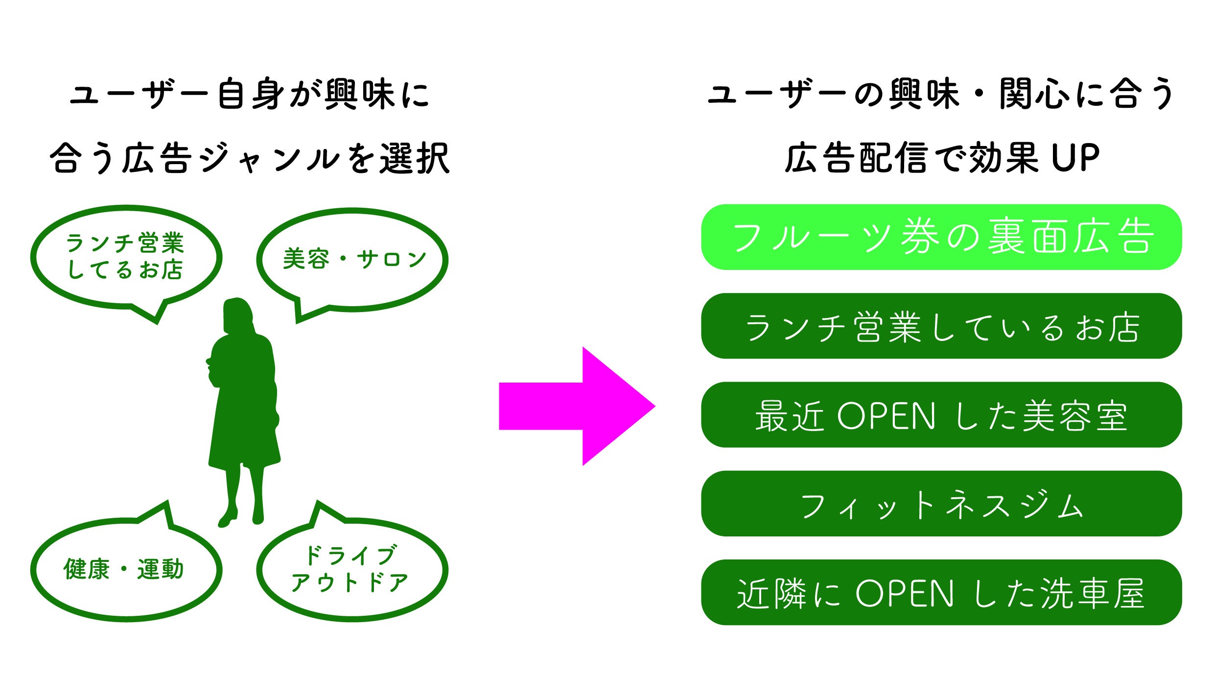 ユーザー自身がフルーツ券申し込み時に、フルーツ券の裏面広告のジャンルを選択することができるため、興味・関心に近い広告を届けることができます。