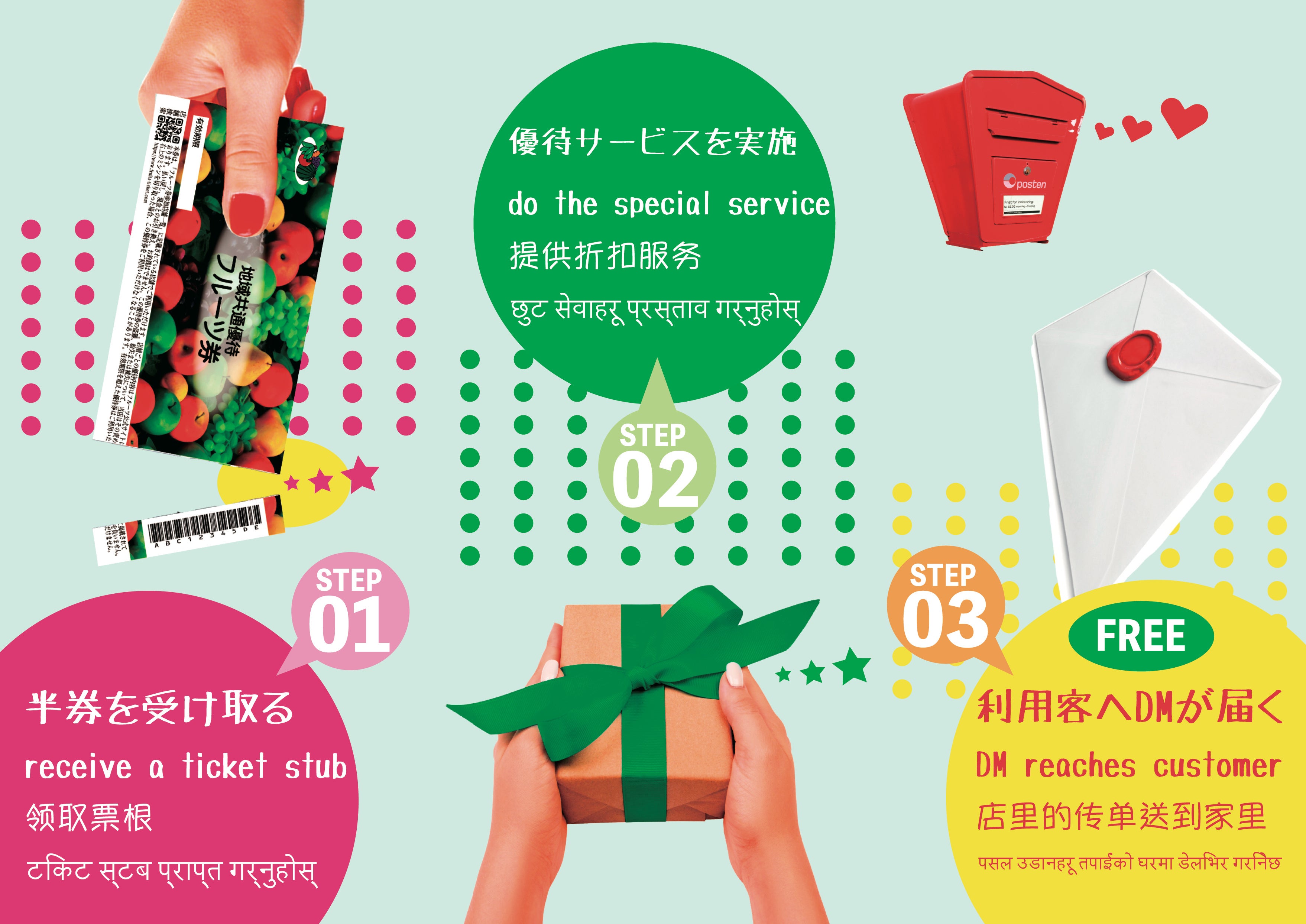 協賛店舗は、集まったフルーツ券の店舗保管部分(以下、半券)と同枚数の店舗販促物(チラシ)を毎月月末に弊社に送付することで、半券のユーザーへ半券1枚ごとに1通を無料で宛名付きDMを送ることができます。