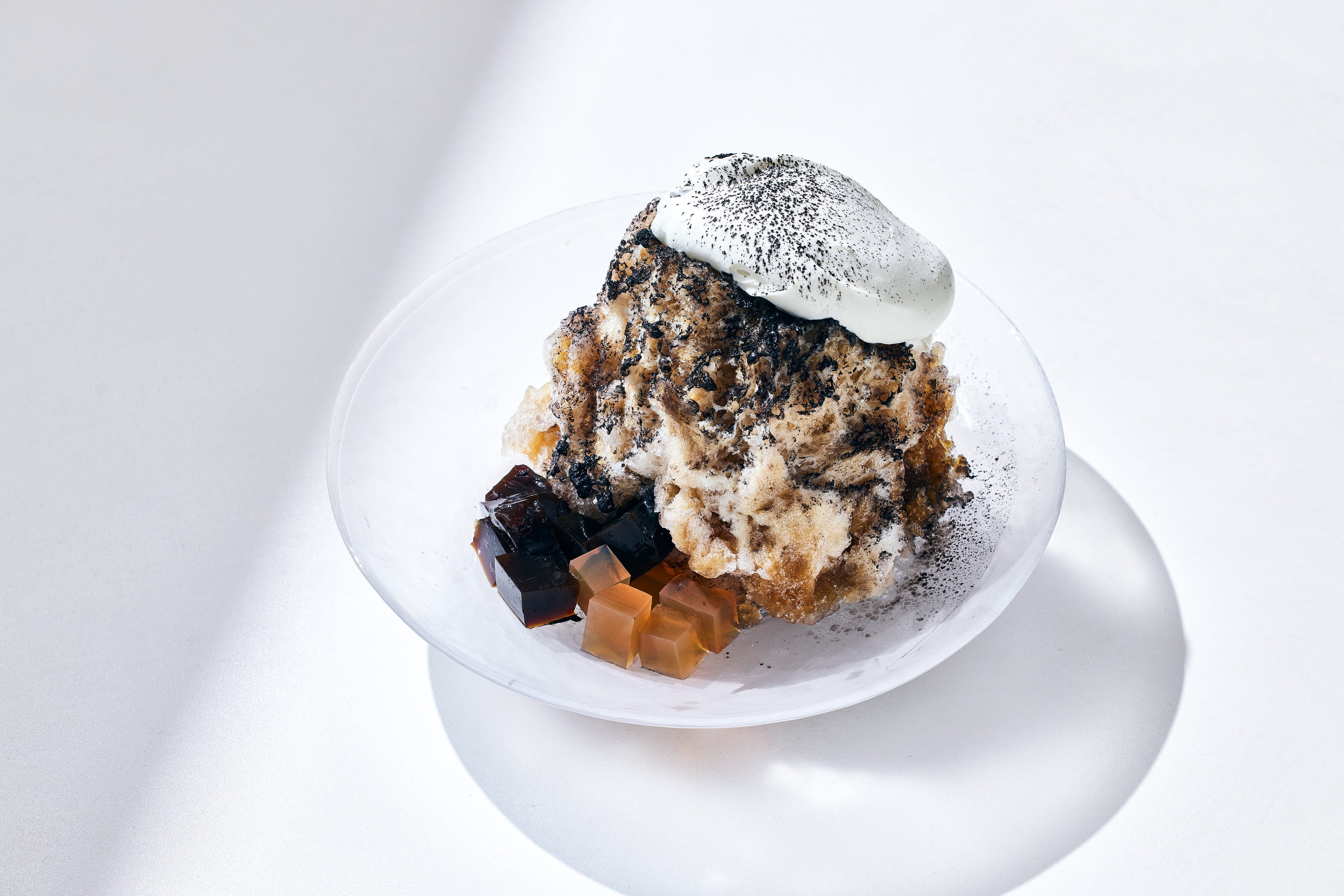 濃厚なエスプレッソのかき氷に、羅漢果茶寒天、珈琲ゼリー、自家製の練乳を添えた、大人な味わいのかき氷。マスカルポーネクリームをかけることで、バランスの良い味わいに仕上げました。