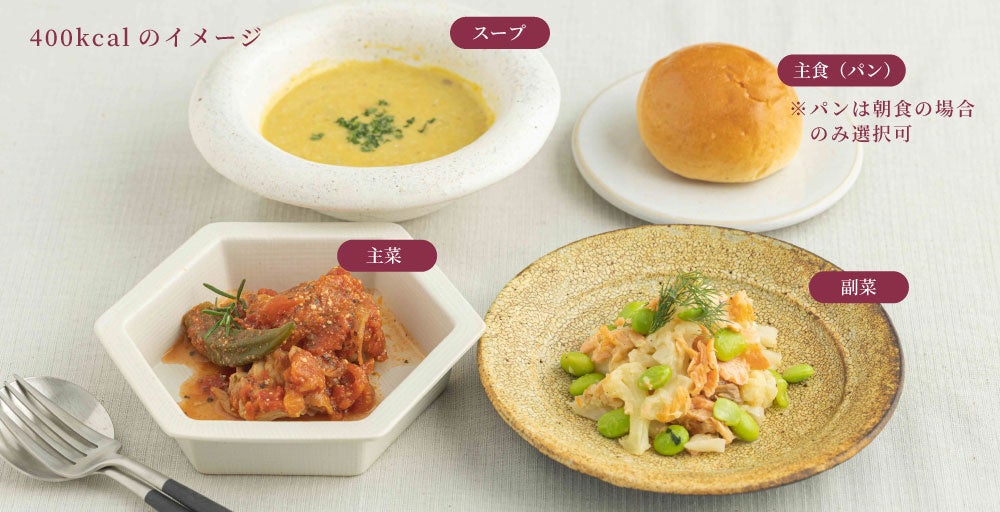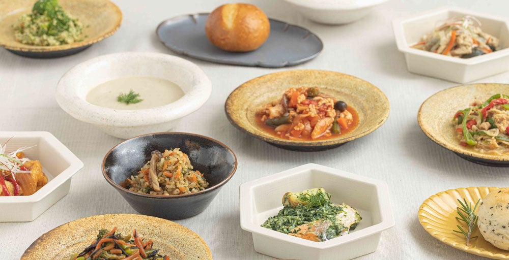 たんぱく質を豊富に含む主菜、ビタミンやミネラルを補う副菜、食物繊維が1日の摂取目安量の10分の1が摂れるごはんとスープ、食物繊維、乳酸菌を16.7億個含むパン、低糖質デザートのラインナップです。