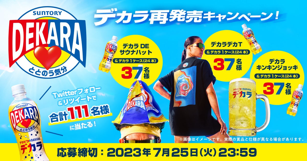 「DEKARA」再発売を記念して、7月11日(火)から7月25日(火)まで、「デカビタC」公式Twitterアカウント(@dekavitaC_jp)にてフォロー&リツイートキャンペーンを実施します。「デカビタC」公式Twitterアカウントをフォローの上、該当のツイートをリツイートいただいた方の中から抽選で合計111名様に、DEKARA500mlペットボトル1ケース(24本)と限定グッズ(全3種:Tシャツ・サウナハット・ジョッキの内、いずれか1種)をプレゼントします。