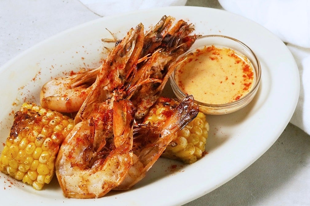 ・有頭海老とトウモロコシのグリル スパイシーヨーグルトディップ添え 980円(税込)