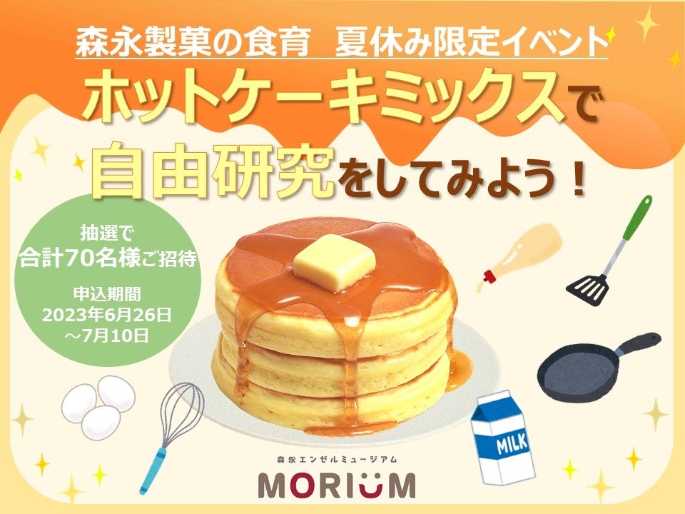 本イベントは、小学4~6年生と保護者を対象としたものです。子どもたちがそれぞれ異なる材料を使ってホットケーキを焼き、食感や味を食べて比較することで「ふわふわのホットケーキを焼くためのコツや秘密」を学ぶワークショップです。そして、森永製菓のホットケーキミックスの研究員がホットケーキ作りの実演や膨らむ理由などの解説を行います。保護者に向けては、ホットケーキミックス活用法などを紹介するセミナーを開催します。午前の部、午後の部、各35名合計70名の方だけ参加することができ、抽選による招待制となります。6月26日(月)にホームページで募集を開始します。