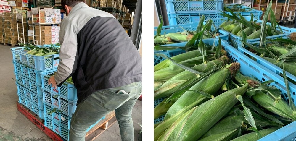 収穫後のとうもろこしは、トラックの荷台でそのまま検品作業に入ります。ひとつひとつ手作業で、虫食いがないかなど確認します。基準をクリアした商品は6時台にはいちやまマートの青果センターへ納品。順次店舗へ配送され、開店時間までに店頭に並びます。