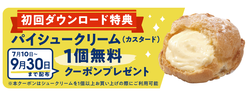 ビアードパパ モバイルアプリのダウンロード特典として「パイシュークリーム(カスタード)1個」のプレゼントクーポンを進呈します。