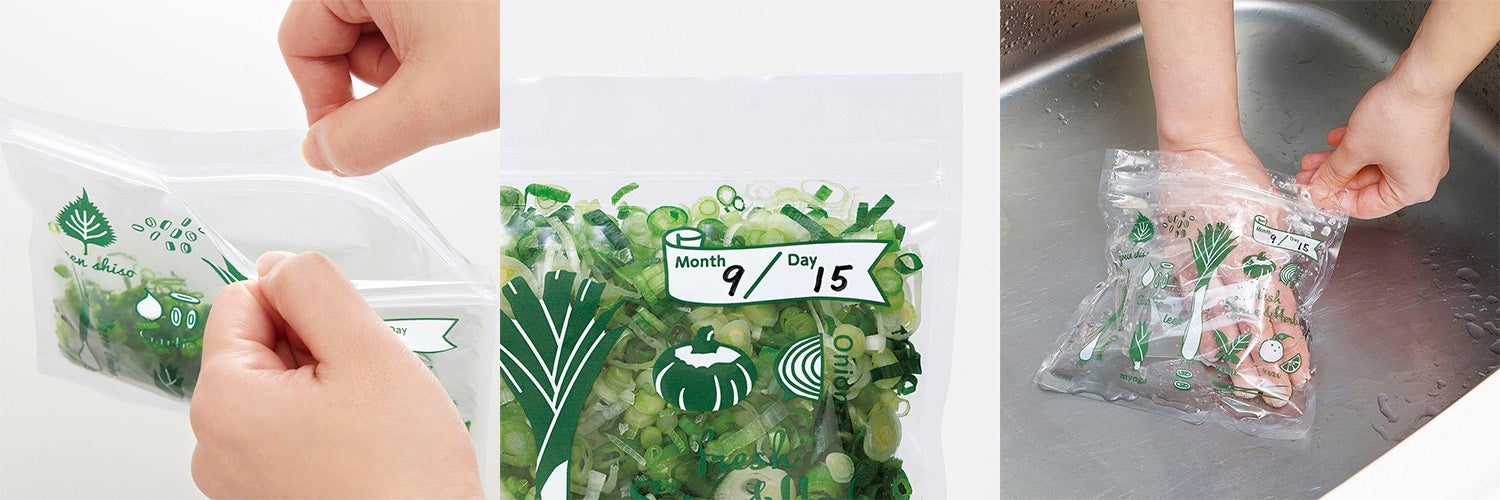 こちらの保存袋は洗って何度も繰り返し使えるので経済的にもやさしい使用となっており、角が丸いので洗いやすく、お手入れもラクラクです!