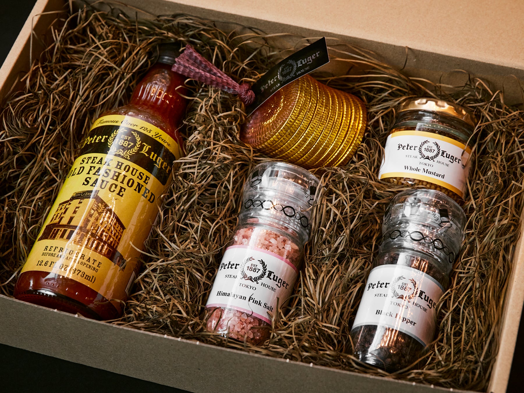 人気の”ルーガーソース”、ヒマラヤピンクソルト、ブラックペッパー、コインチョコレートを詰め合わせたギフトセット。