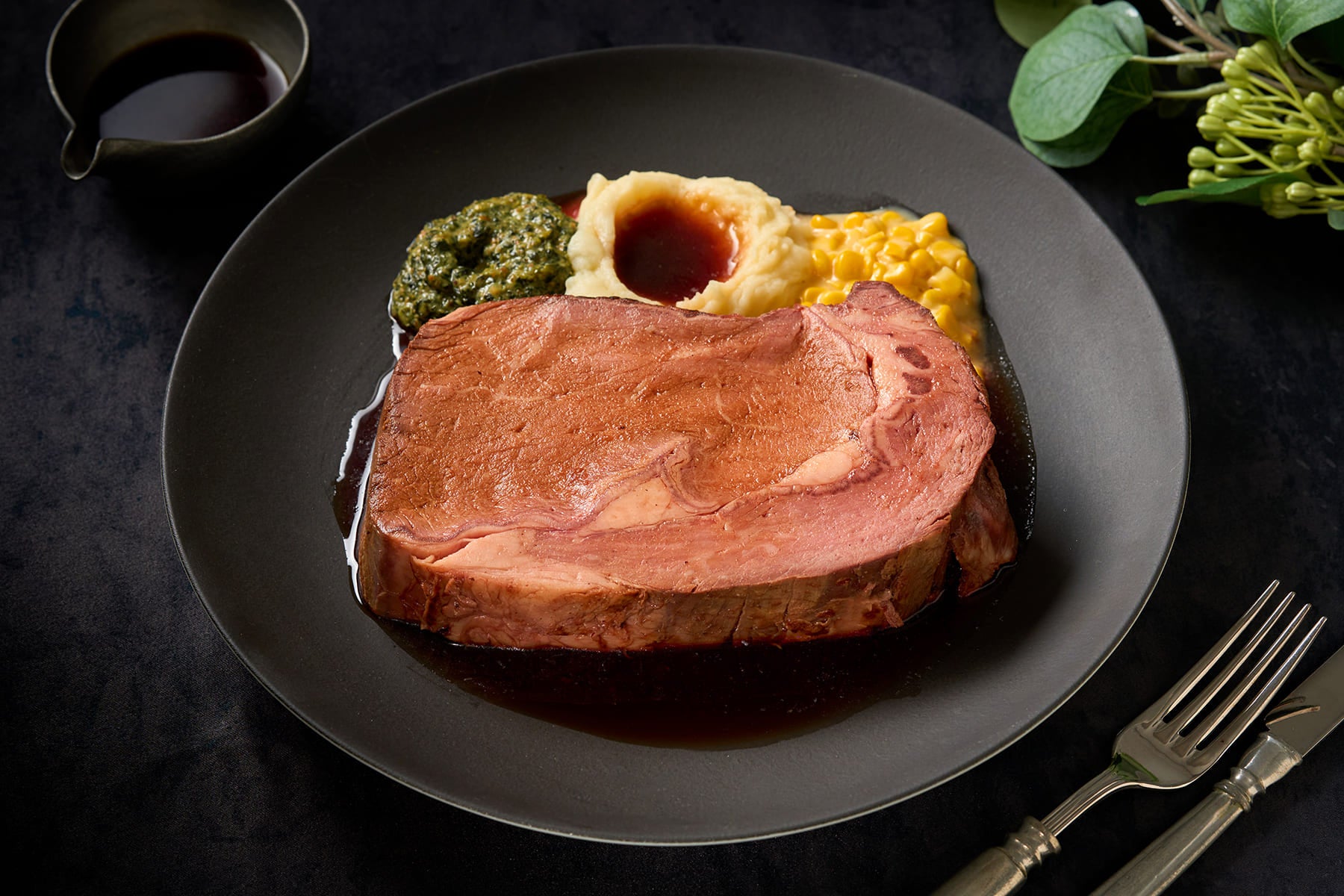 厚切りプライムリブと人気のアカンパニメンツ3種、マッシュドポテト・クリームドスピナッチ・クリームドコーンをお楽しみいただけるセットです。