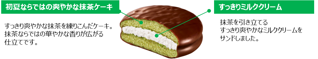 爽やかな味わいの抹茶ケーキに軽いミルククリームを合わせたオペラケーキをイメージしたチョコパイです。