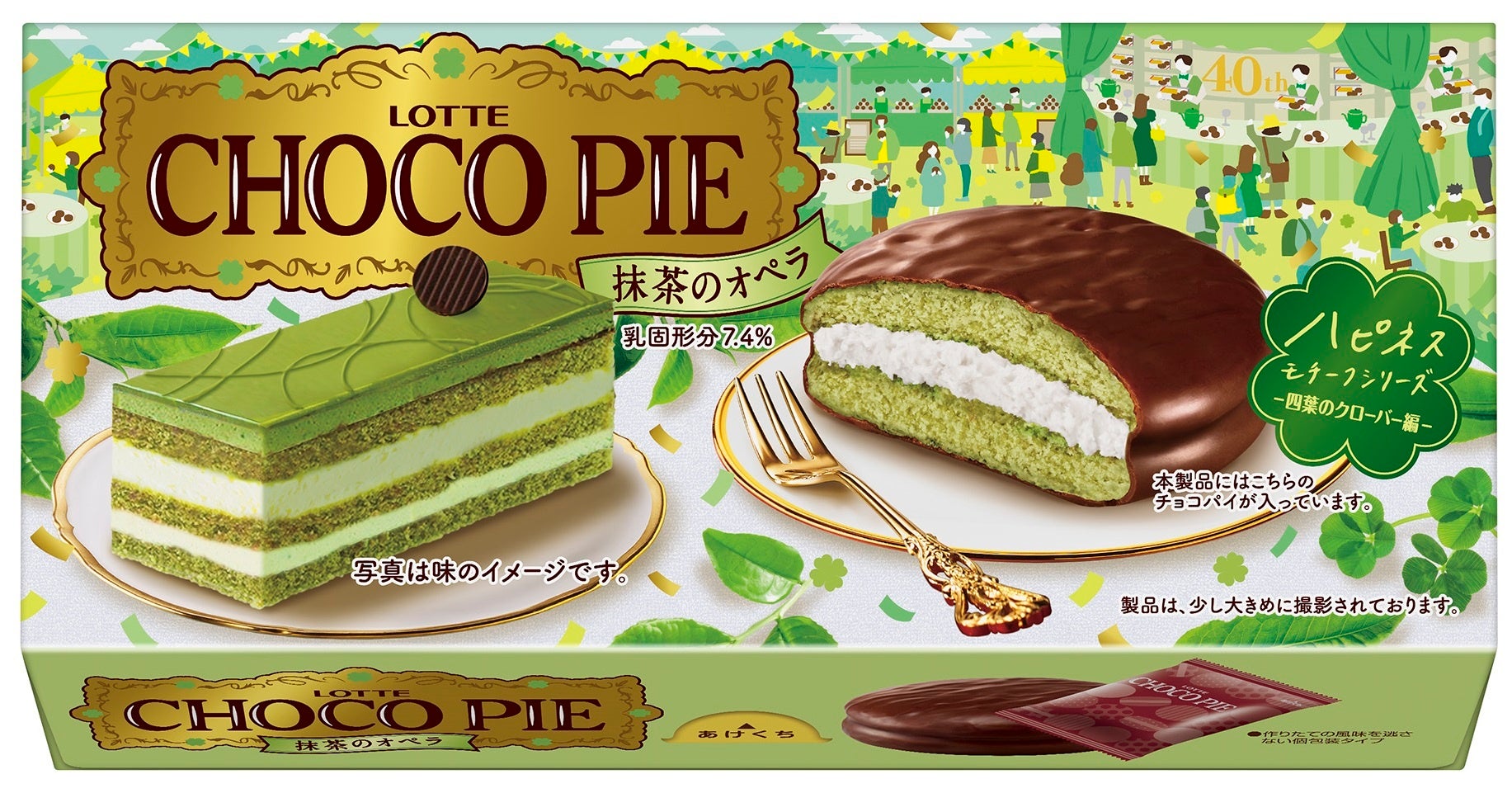 株式会社ロッテは6月27日(火)、元気な気持ちになれる色やケーキをモチーフにした、チョコパイブランドの新シリーズ「ハピネスモチーフチョコパイ」の第2弾「チョコパイ<抹茶のオペラ>」を発売します。今回のハピネスモチーフは幸せを象徴する四葉のクローバー。爽やかな味わいの抹茶ケーキに軽いミルククリームを合わせたオペラケーキをイメージしたチョコパイです。また個包装には“今日の占い”メッセージ付きで、食べるたびにワクワクした気持ちをお楽しみください。