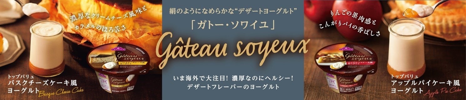 イオンはこうしたお悩みに着目し“ご褒美デザート”の領域でヨーグルトの新たなニーズの開拓を目指して「トップバリュ ガトー・ソワイユ」を企画・開発しました。通常のヨーグルトと比較し、脂肪分を高めにすることで酸味を抑えながら、なめらかでもったりとした舌触りに仕上げ、フランス語で「シルクのようなお菓子」という意味を込めて名付けた濃厚デザートです。ヨーグルトのため、一般的なケーキやアイスクリームなどと比べてカロリーや糖質が少なく、罪悪感を抱かずに楽しむことができます。「バスクチーズケーキ風」と「アップルパイケーキ風」のフレーバーを発売します。