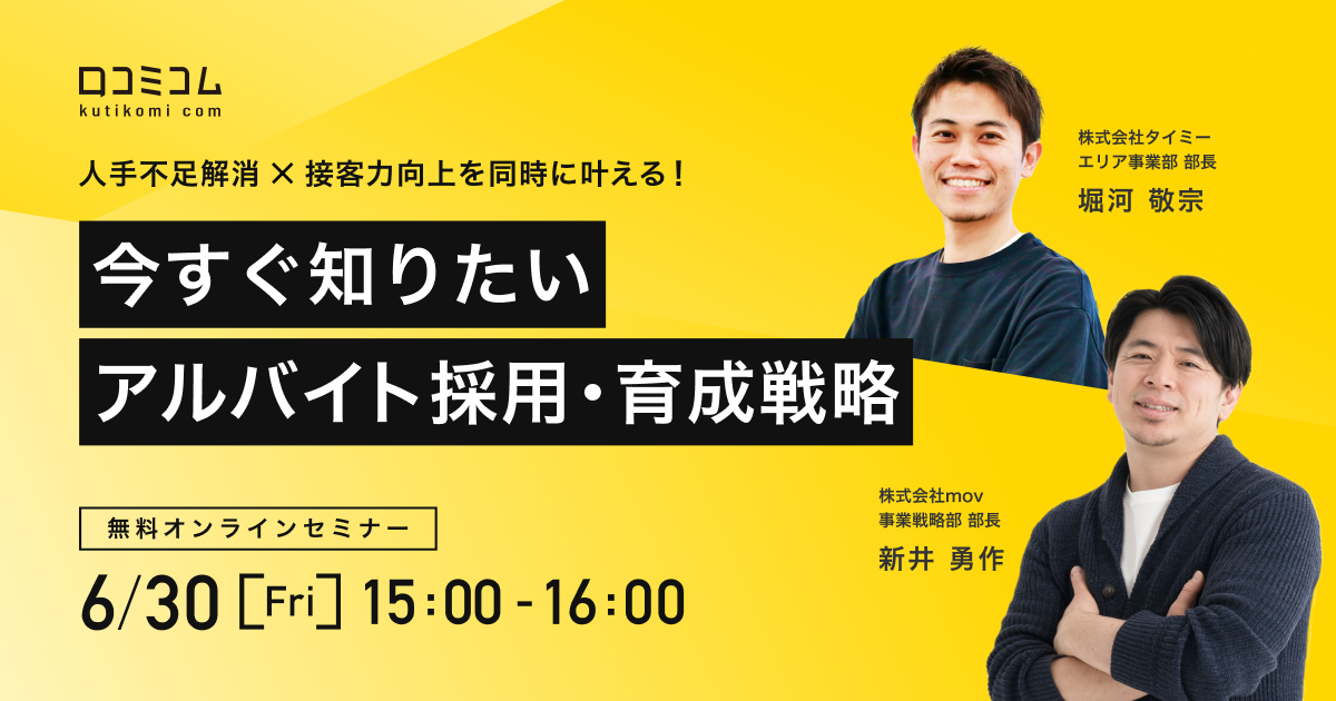 コロナ禍がある程度収束し、飲食店や小売店、宿泊施設などでは急激な需要回復に伴う人手不足に悩んでいる企業様も多いのではないでしょうか。 そこで今回は、スキマバイト募集サービス「タイミー」とともに、アルバイトの採用戦略に関するセミナーを開催いたします。 人手不足を解消したい方や、短期アルバイト採用による接客満足度の低下を懸念されている方など、アルバイトの採用・育成にお悩みの方、必見です!