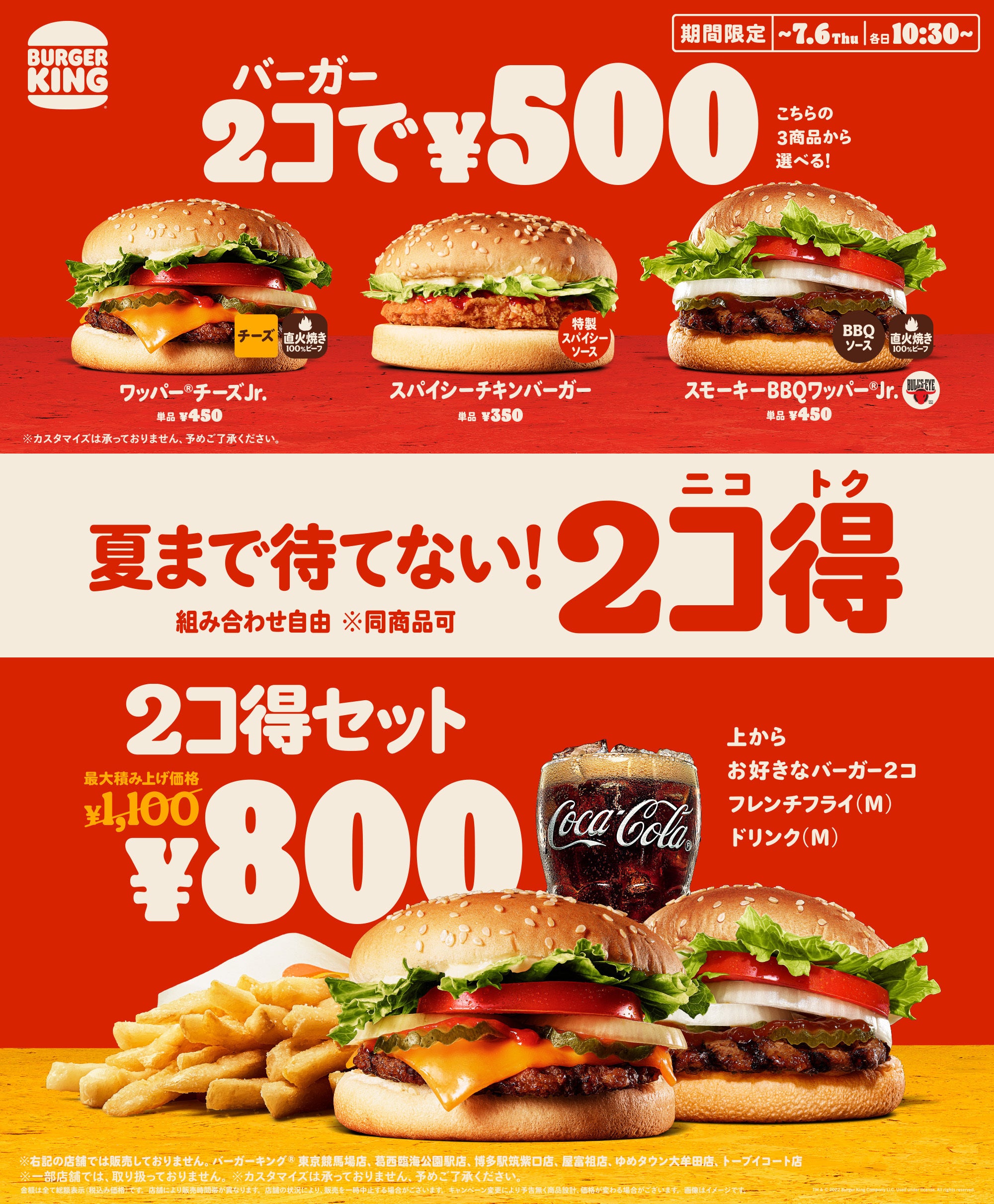 バーガーキング® にまだご来店いただいたことがない皆様も、バーガーキング® ファンの皆様も、バーガー2個で500円、セットで800円のお得なキャンペーン「2コ得(ニコトク)」をぜひご利用ください。