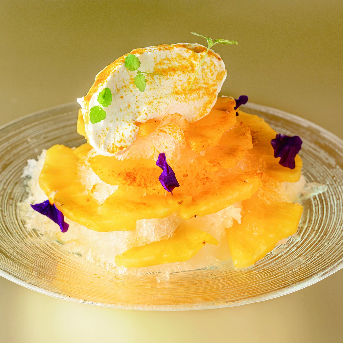 パイナップルを主役に据えた華やかなかき氷。ハチミツレモン&パインのコンフィチュールと2種類の異なるシロップが爽やかさを演出してくれます。氷の上にはココナッツクリーム、氷の中にはホワイトチョコレートと生姜のエスプーマを忍ばせて、ターメリックとガラムマサラのスパイスで仕上げました。意外な素材の組み合わせが生みだす奇跡のバランスをぜひ。