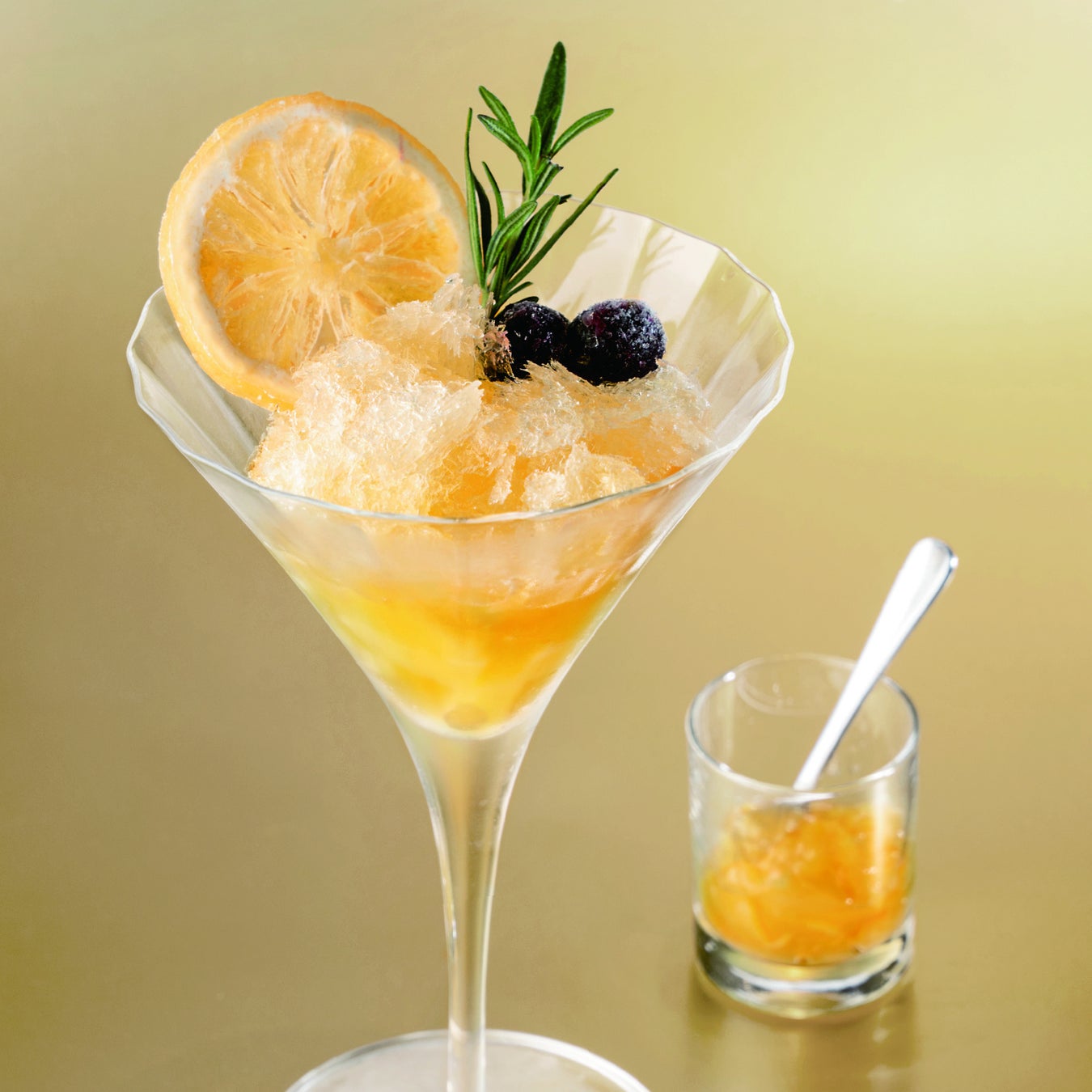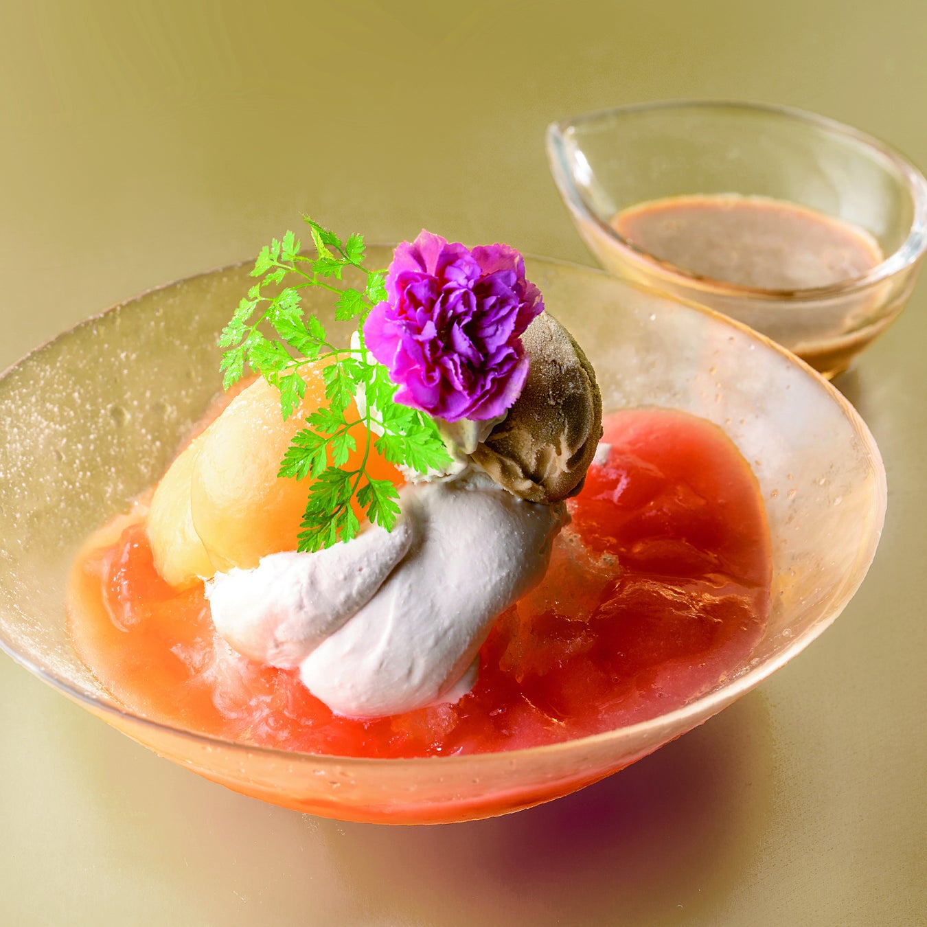 濃厚な甘味と華やかな香りが広がるフランス・ソーテルヌ地区の貴腐ワインを凍らせてグラニテにし、食感のアクセントとしてパイナップルを潜ませました。味に変化をつけたくなったら、別添えのマーマレードジャムをお好みで。溶けていくワインのグラニテとグラスを彩るフルーツとのマリアージュをカクテル感覚でお楽しみ下さい。※アルコールを使用しています