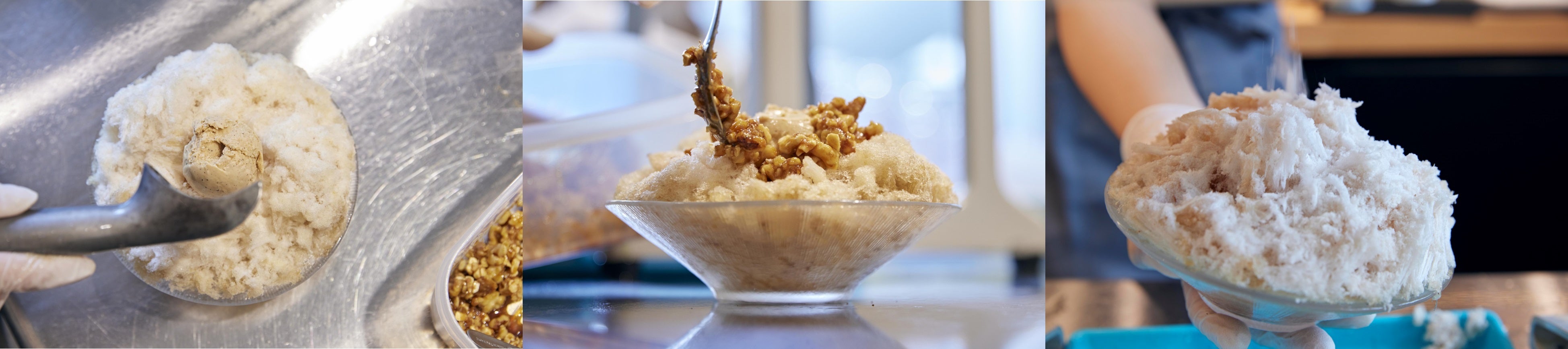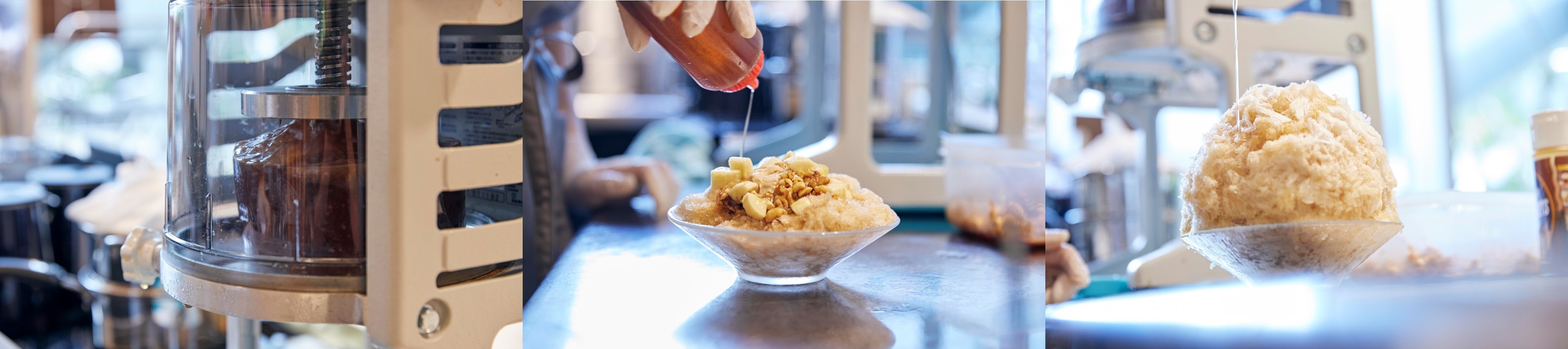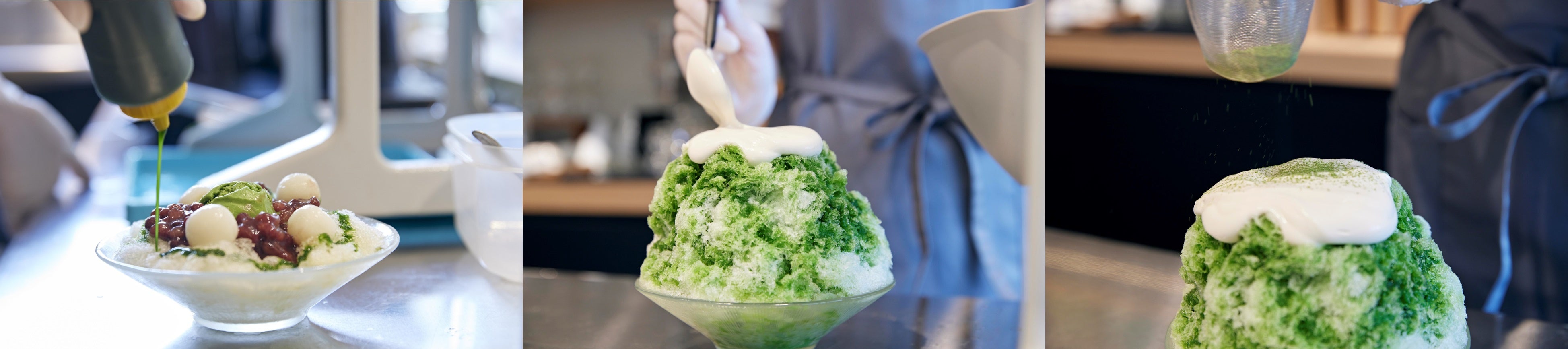 THREE TEA CAFEから初登場となる夏スイーツは、抽出したお茶を凍らせて作る「茶氷」に濃厚なお茶シロップをかけることで、口にいれた瞬間、爽やかにお茶が香る新感覚のオリジナルかき氷です。自家製マスカルポーネクリームをトッピングし、氷の中にそれぞれのお茶にぴったりの食材とティージェラートを包み込んだ茶氷は、食感やなめらかなくちどけを愉しめるお茶専門カフェならではの味わいに仕上がっています。あたたかいほうじ茶と一緒にお召し上がりください。茶氷はイートイン限定で、まろやかな旨味を感じるかぶせ茶を使った「白玉ぜんざい抹茶」、ベルガモットの香り豊かな紅茶を使った「レアチーズアールグレイ」、芳醇な焙煎香が特徴の台湾茶を使った「塩キャラメル鉄観音」の3種類を、6月27日(火)よりメニューを入れ替えながら1種類ずつ順次発売します。