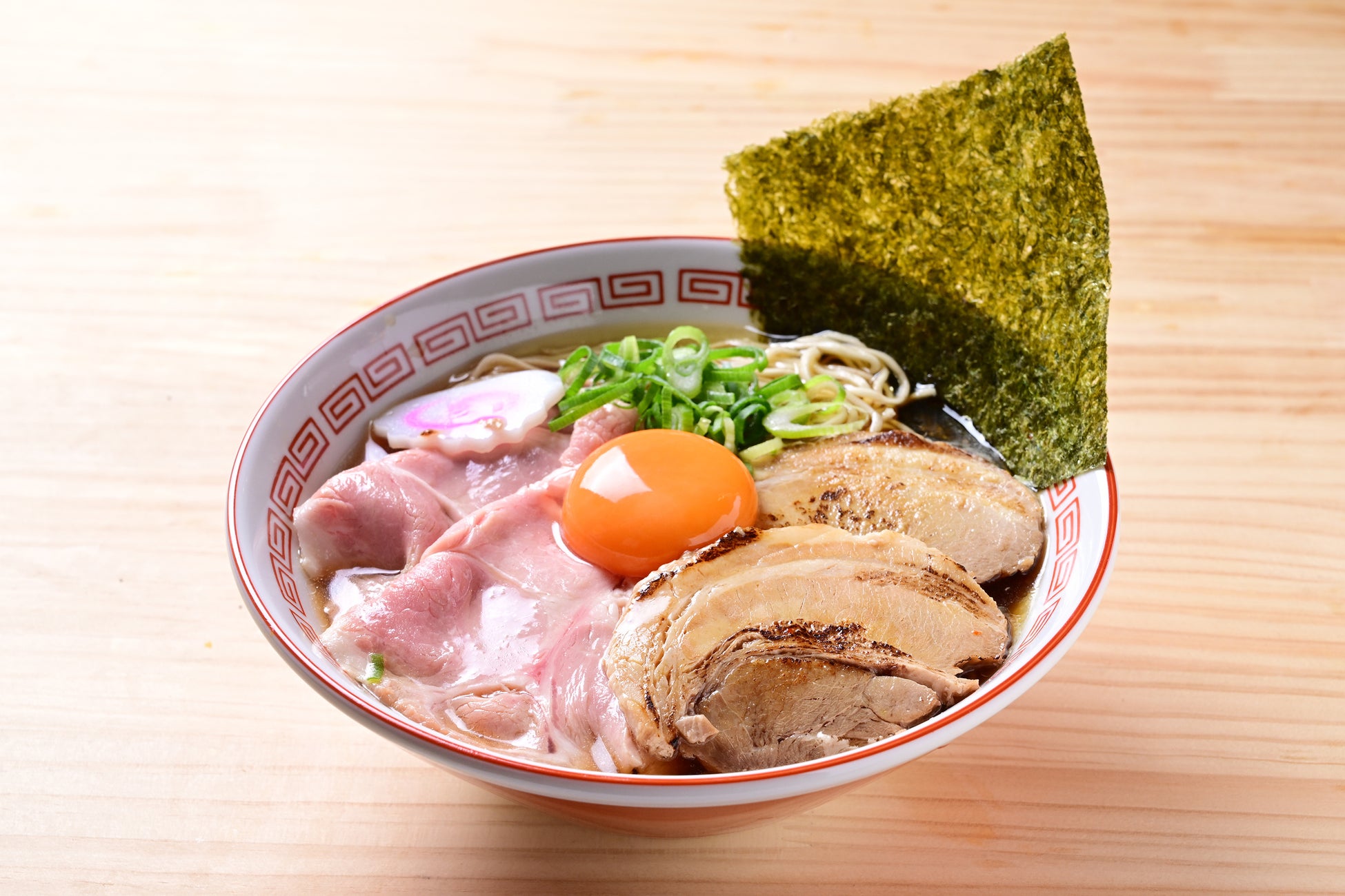 国産鶏の芳醇な香りとコクのある深い出汁、老舗蔵元の再仕込み熟成醤油の豊かな風味と深みのバランスをぜひご堪能ください。途中、卓上に設置されたアイテムで味変や、残った出汁と銀しゃりでラーメン茶漬けとしてもお召し上がり頂けます。レアチャーシュー2枚、とろとろのバラチャーシュー2枚が乗った特製盛りはお月見付き。