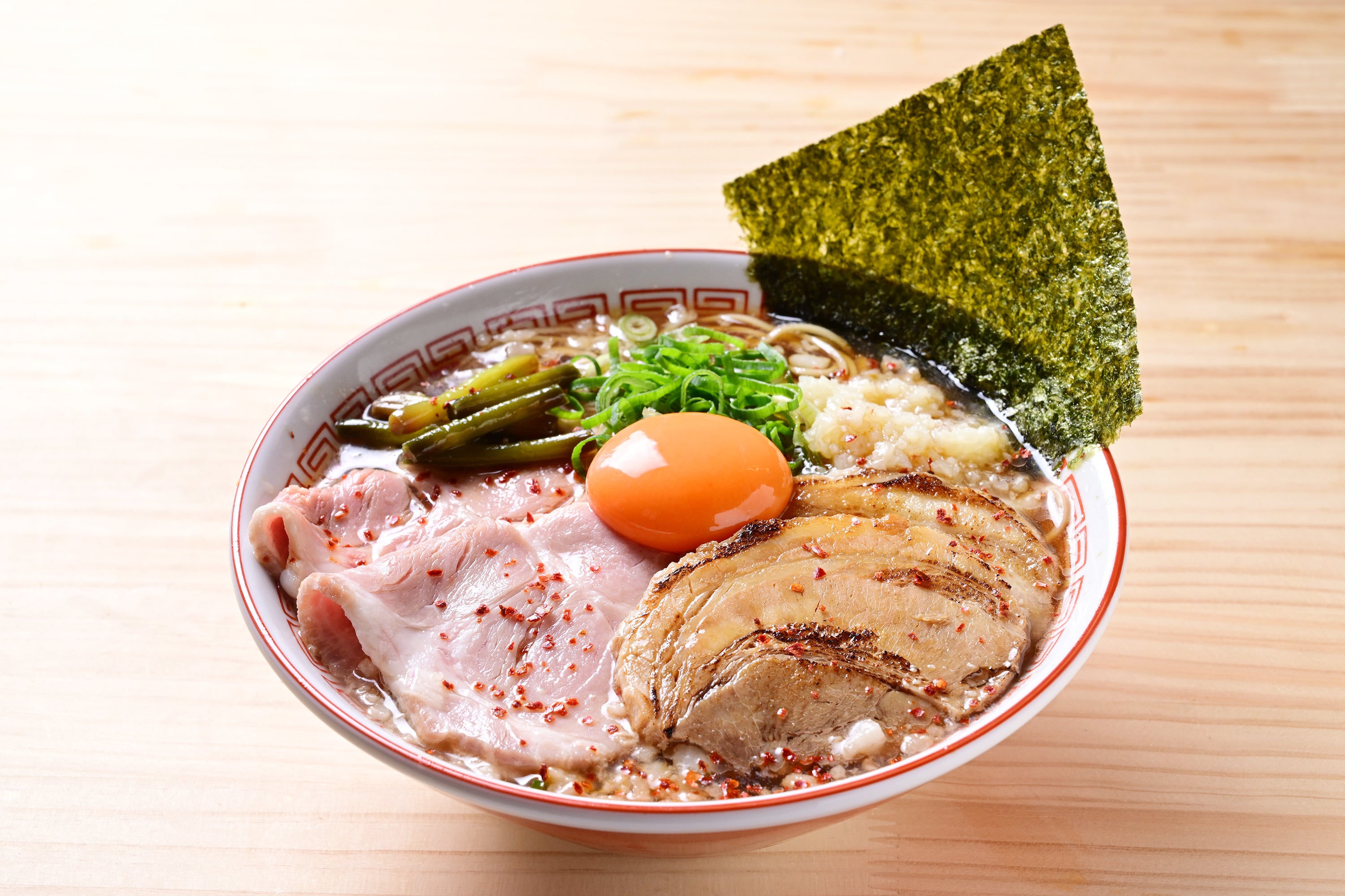 粗挽き背脂の旨み・ニンニク・鷹の爪・トッピングにニンニクの芽でベースの国産鶏の出汁をアレンジし、バチバチ系の中華そばで背徳感満載で仕上げました!途中、卓上に設置されたアイテムで味変や、残った出汁と銀しゃりでラーメン茶漬けとしてもお召し上がり頂けます。レアチャーシュー2枚、とろとろのバラチャーシュー2枚が乗った特製盛りはお月見付き。