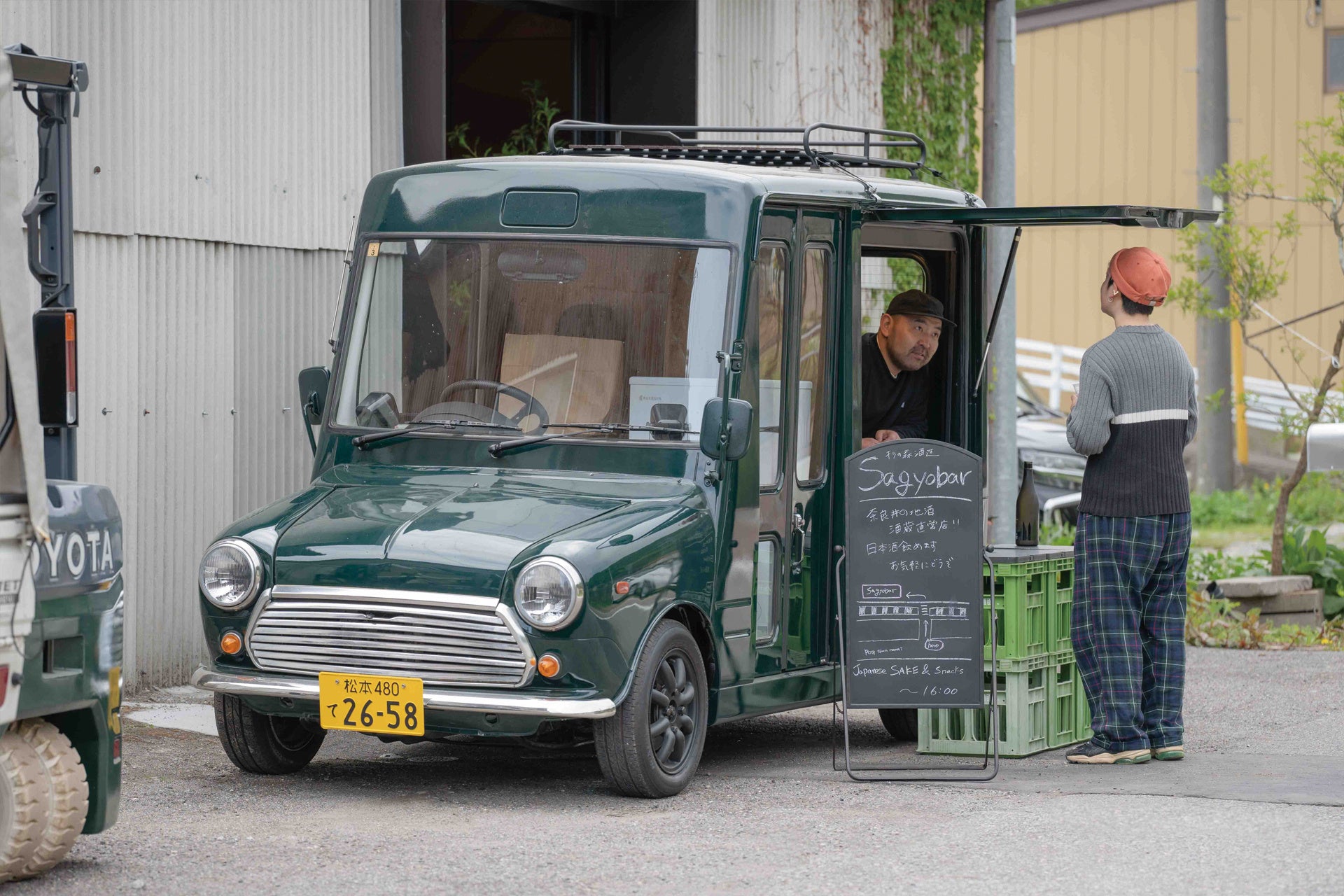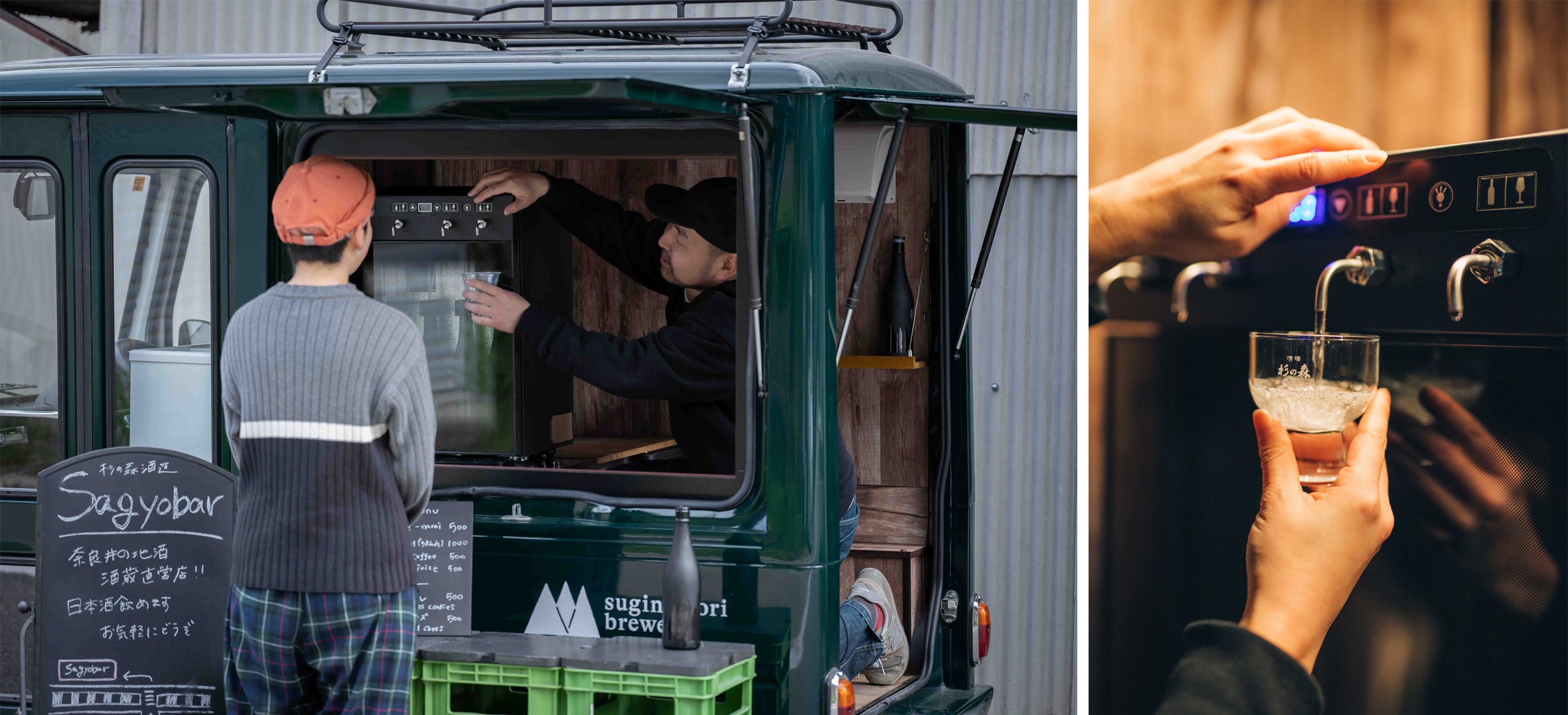 sagyobar と合わせ新たに導入したsuginomori wagonは、軽自動車を整備し、飲食営業許可を取得した販売車です。車内には日本酒サーバーや、冷蔵庫も搭載しており、最適な状態で商品を提供します。