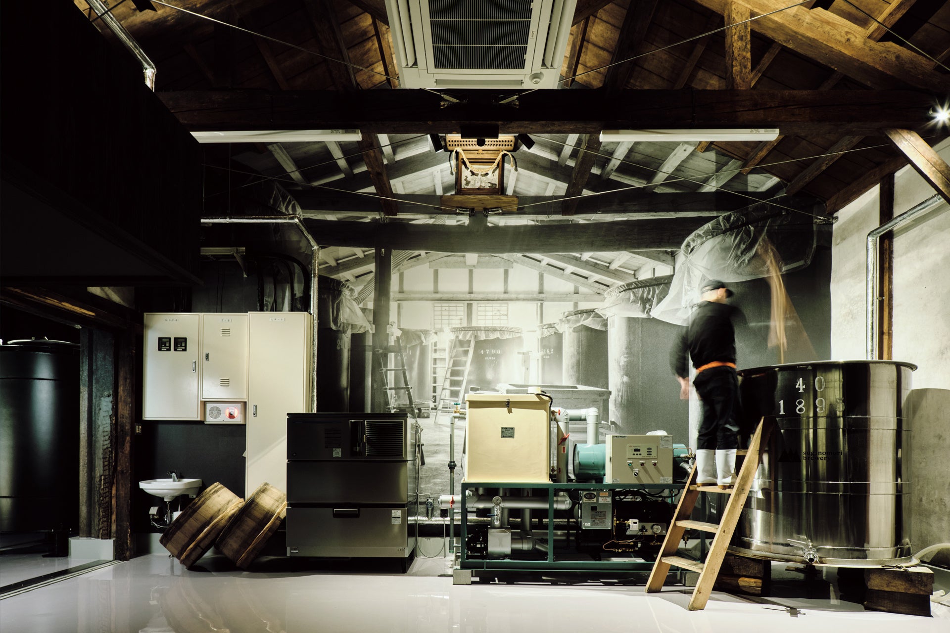 改修を行った倉庫は、元々は旧杉の森酒蔵の機材や業務備品の保管用の場所として利用されていました。今回は倉庫の建築はそのままに、入り口部分のゲートを刷新し、照明や空調等の設備を新設。什器は酒蔵の作業でも使用する日本酒瓶を運ぶための外装容器「P箱」を活用しています。また、製造環境の向上として、新たに日本酒保管用の冷蔵室を設け、梱包用段ボールの組み立てや、配送準備などの出荷作業もできる場に生まれ変わりました。