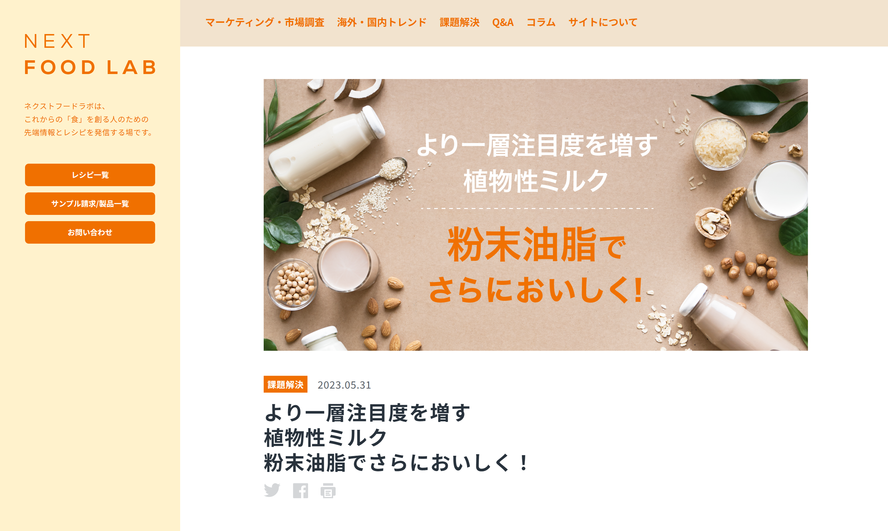 「課題解決」は、食品の商品開発の課題に対するソリューションをミヨシ油脂が提案するとともに、開発や企画のヒントとなる情報を紹介するカテゴリーで、「ミヨシ未来プラットフォーム」のなかにある、これからの「食」を創る人のための先端情報とレシピを発信するサイト「ネクストフードラボ」に新設しました。その第1弾として、「飲料商品開発の課題解決」の連載を開始しました。毎回品目ごとに取り上げ、連載第1回では、植物性ミルクの特徴や、味や見た目などの課題を粉末油脂で解決する方法を掲載しています。