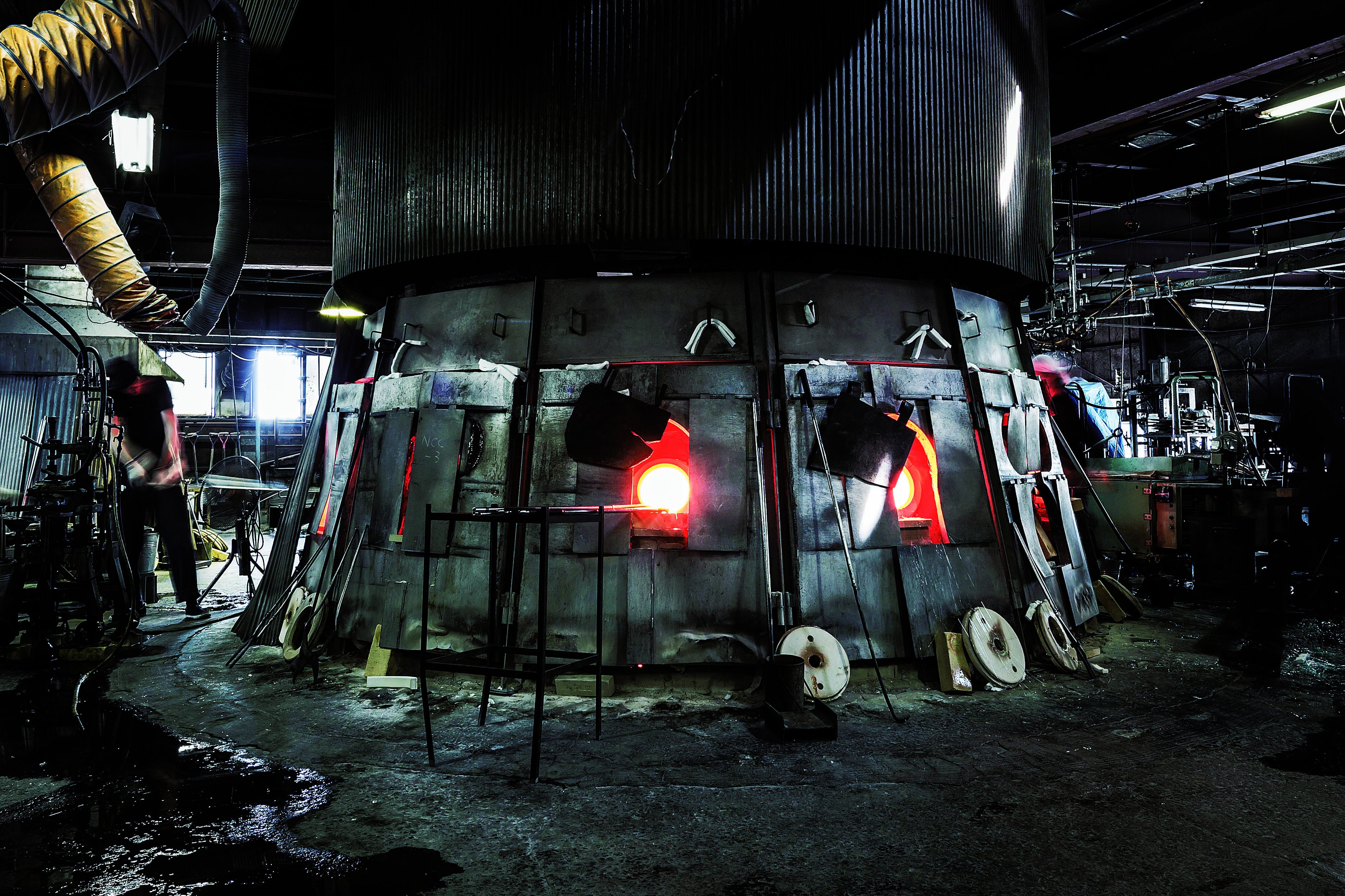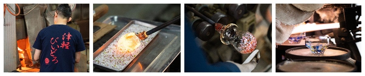 約1,400度に熱された坩堝(るつぼ)からガラス原料であるタネを取り出し、金型に入れてマウスブローで成形する“型吹き”製法で作られています。量産可能な製法ではありますが、金型に均一にガラスを行き渡らせるためには職人の熟練した技術が必要です。制作は4人1組で行われ、タネ取り・色ガラス(シモ)付けとブロー(成形)・モイル(口部の余剰ガラス)外しと徐冷、というように分担・連携して一つの盃が作り上げられます。