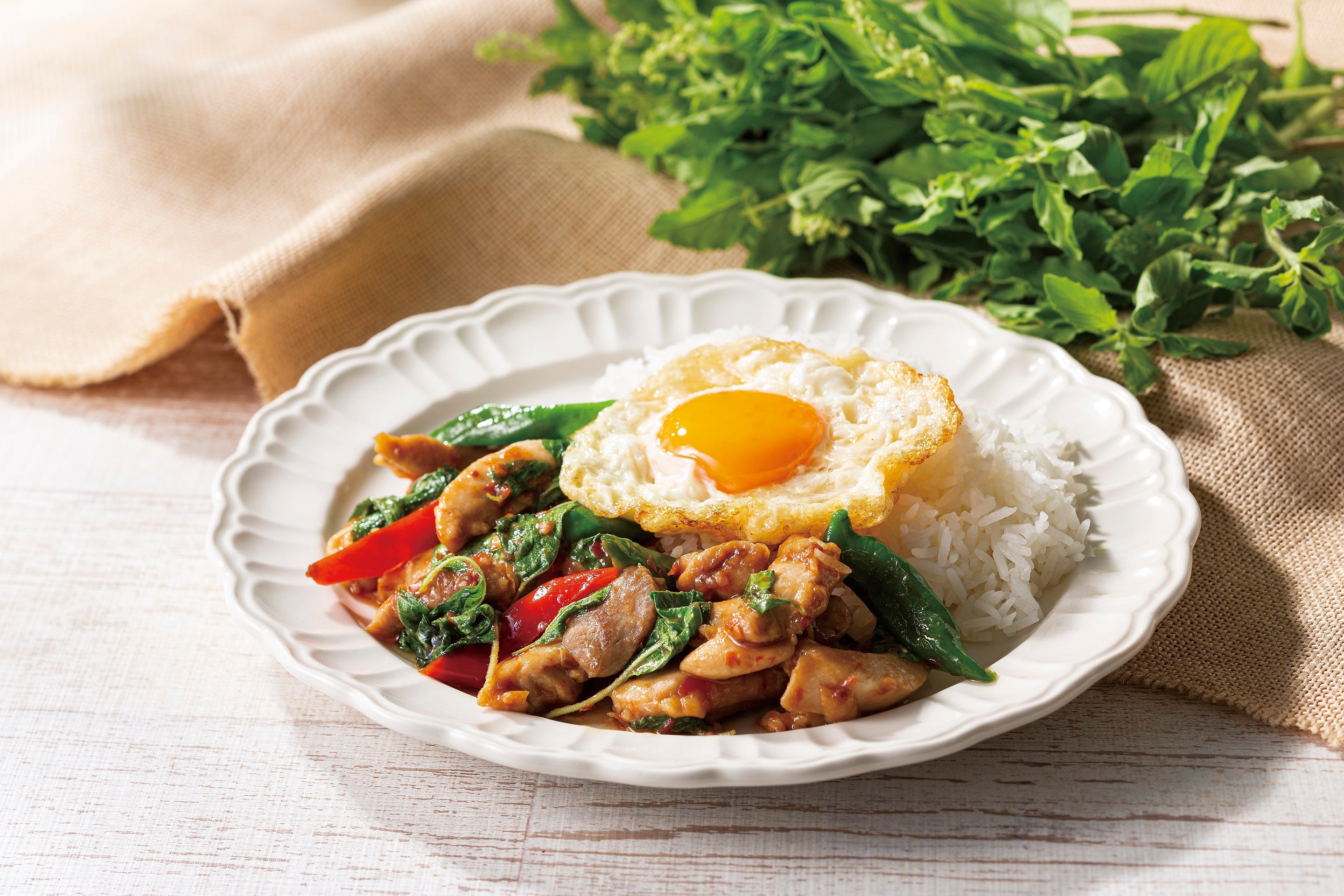 国産で生葉のタイバジル”ガパオ”をたっぷり使って、柔らかいタイ産「米どり」、国産の生唐辛子と炒めたガパオ炒めはスパイシーで芳醇な香りが広がり、”タイ”を存分に感じられる一皿です。タイから輸入した香り米「ジャスミンライス」との相性もぴったりで、揚げ目玉焼き”カイダオ”をくずして混ぜるとまろやかな味わいに。今しか楽しめないフレッシュな”ガパオ”&唐辛子の香りと味わいをぜひお楽しみください。