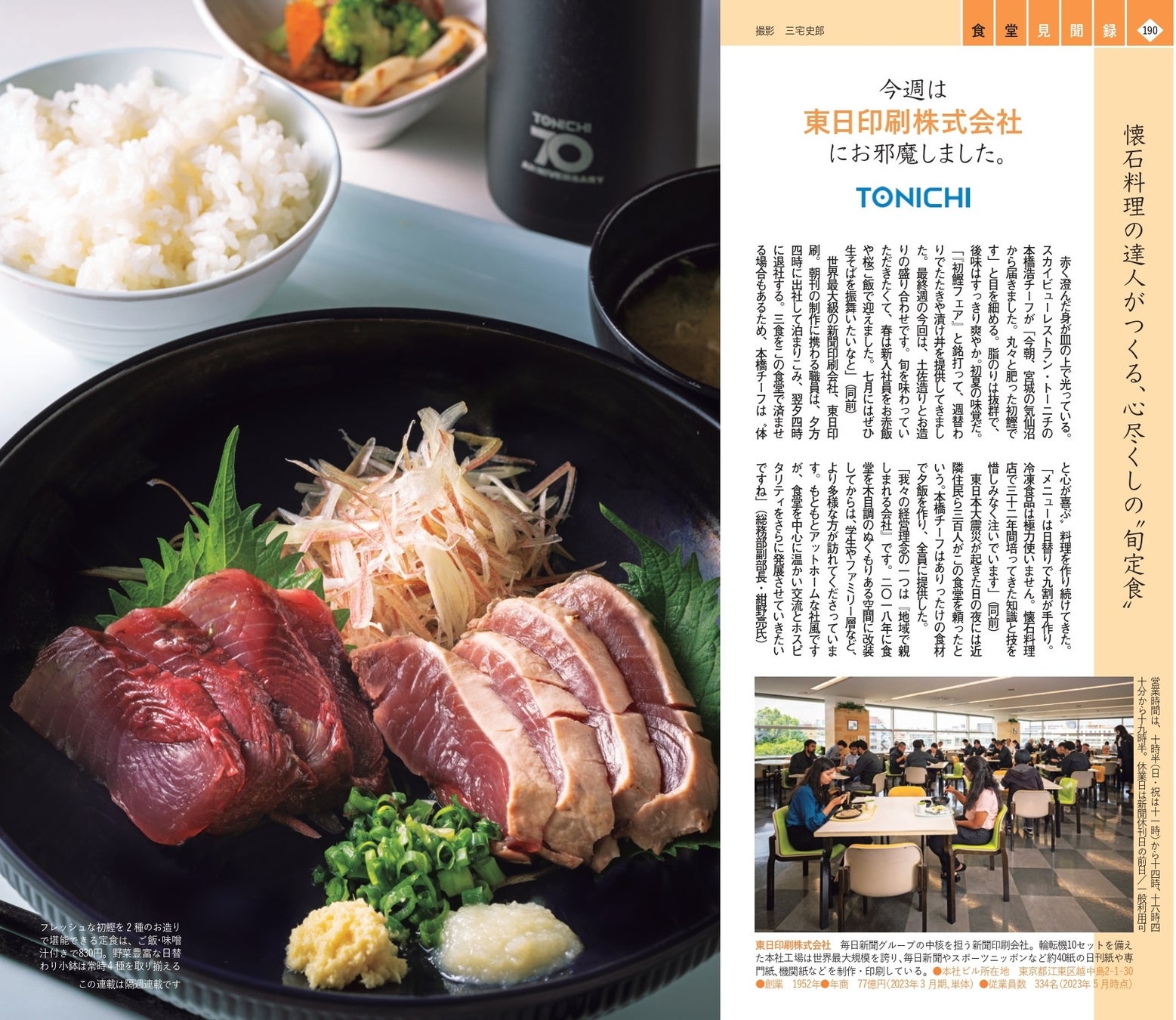 取材にお越しいただいたのは5月に開催した「初鰹フェア」の最終日。記者さんは『土佐造りの盛り合わせ』を召し上がり、「脂のりが抜群で後味はすっきり爽やか。初夏の味覚ですね」と社員食堂とは思えないレベルに驚かれました。その後、食堂チーフの食に込める思いや地域に親しまれる食堂を目指した運営をしていることなどを取材していただき、社員が食事をしている様子も撮影されました。食堂写真の手前に写っているのは、TONICHIで活躍するインド工科大学卒のエンジニア陣で、ベジタリアンのインド人社員のために肉・魚・卵を一切使わないカレーも普段から提供しています。