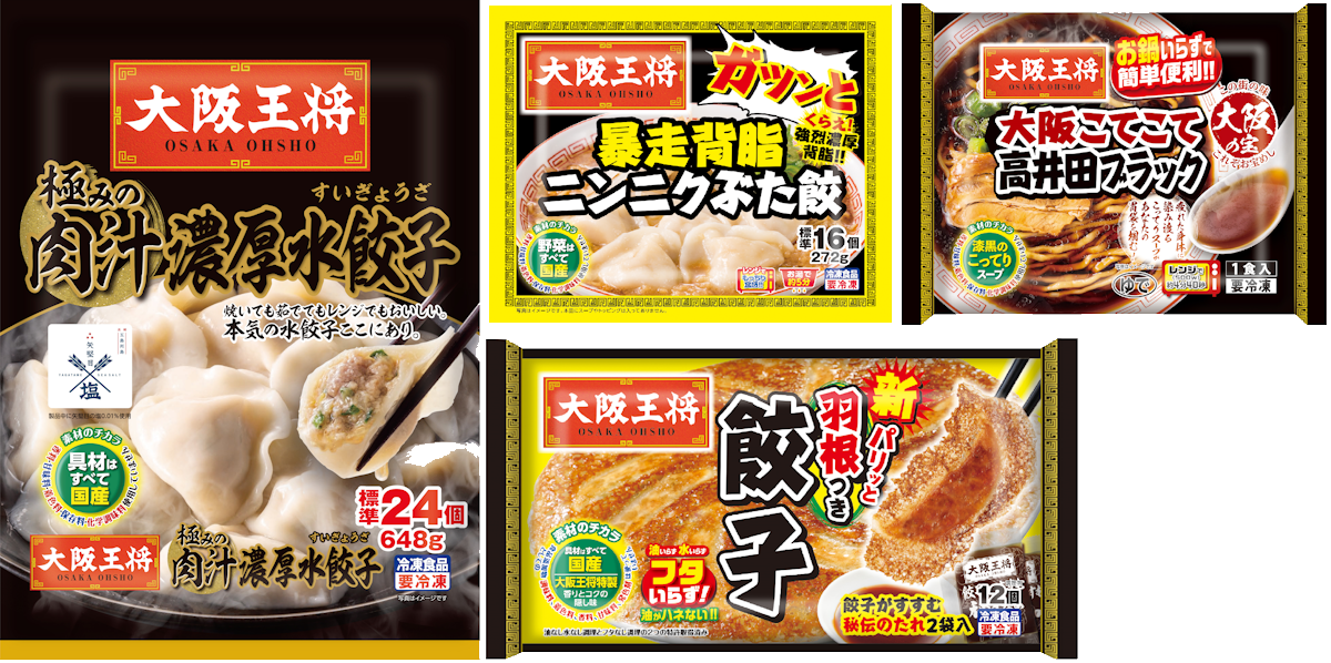 カテゴリーシェアNo.1を誇る水餃子には、大阪王将ならではのユニークなアイテム『大阪王将 暴走背脂ニンニクぶた餃』が新登場です。また、発売直後から話題となった「極み」シリーズは、好評だった“肉汁”によりフォーカスした「極みの肉汁」シリーズとして強化、水餃子も仲間入り。毎日の食卓へ気軽に水餃子を取り入れていただけるよう、バリエーション豊かに展開してまいります。