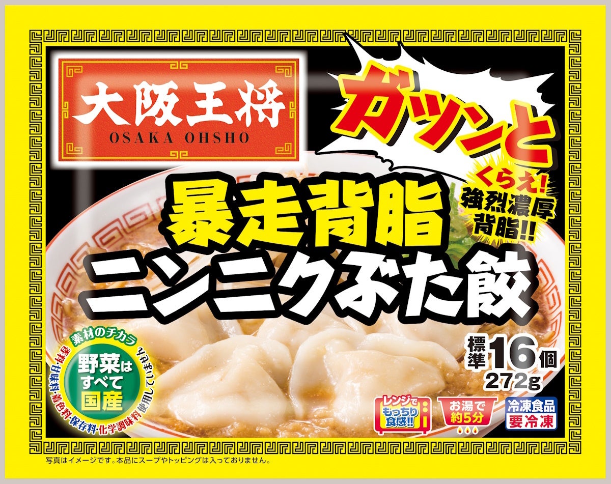 豚の背脂をぷるもちの皮で包み込んだ、今までにない新しい水餃子が登場します。その名も『暴走背脂ニンニクぶた餃』。とろける豚の背脂と、背脂の旨味をひきたてるおろしニンニクは、背徳感マシマシ。こってり濃厚な水餃子は、そのまま食べてもおいしいのですが、ラーメンにトッピングすると絶品。袋麺なら、一緒にお鍋で煮込むだけで背徳感マシマシの背脂にんにくラーメンの完成です。大阪王将は、冷凍水餃子のシェアNo.1ブランドとして、水餃子の手軽さ、おいしさをお伝えしてまいります。