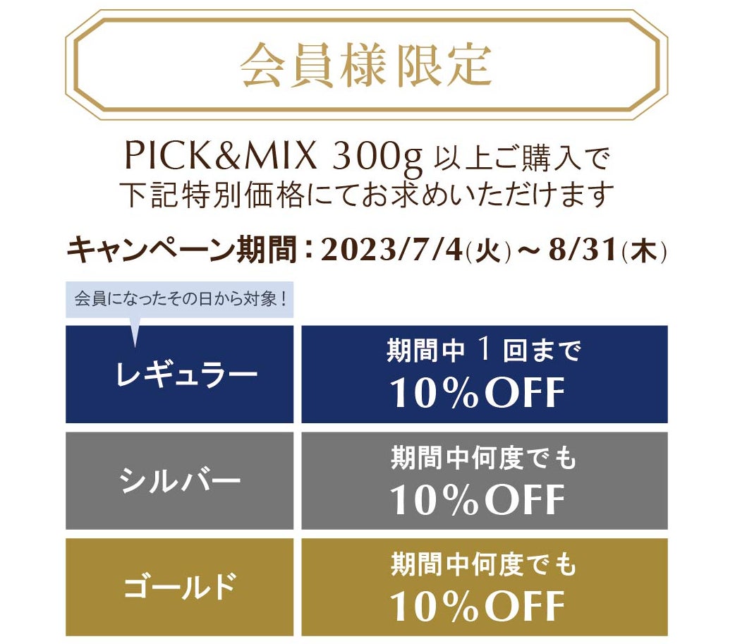 期間中PICK&MIX 300g以上のご購入でお会計より10%オフさせていただきます。