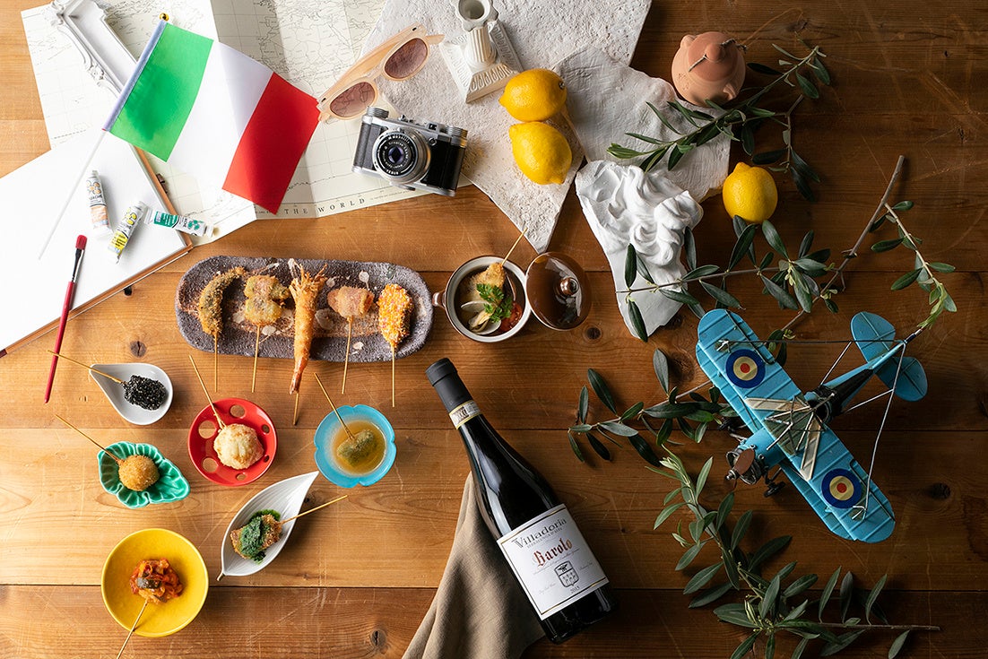 新鮮な魚介類や旬の野菜を楽しむ創作串揚げと、選りすぐりのワイン