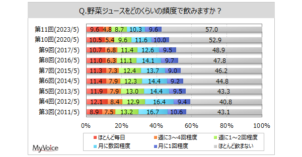 野菜ジュースを飲む人は4割強で、2012年以降減少傾向です。「週1回以上」は2割強、飲用者の5割強となっています。