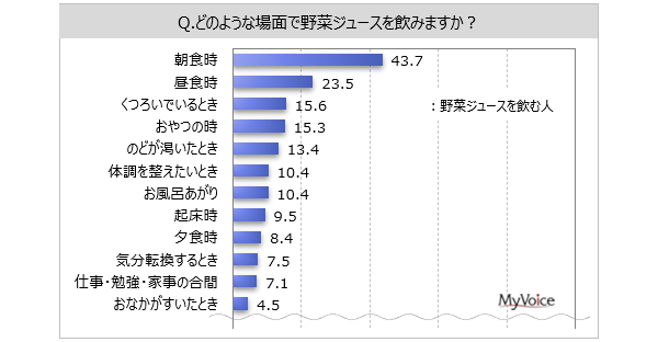 野菜ジュースの飲用場面は(複数回答)、「朝食時」が飲用者の43.7%、「昼食時」が23.5%、「くつろいでいるとき」「おやつの時」が各15%台です。10・20代では「起床時」の比率が高く、「朝食時」が低くなっています。