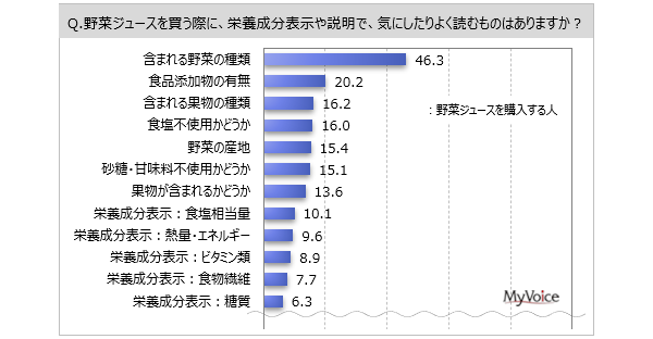 ■野菜ジュース購入時に、栄養成分表示・説明で気することは、「含まれる野菜の種類」が購入者の約46%、「食品添加物の有無」が2割、「含まれる果物の種類」「食塩不使用か」が各16%台