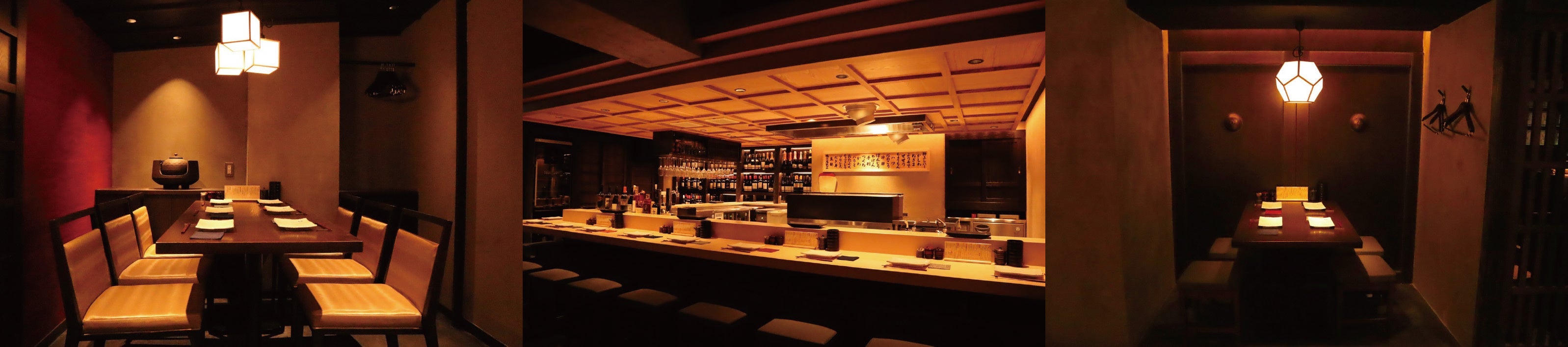 開放感溢れる店内で、ひときわ目を引く白木のカウンター席。目の前で、職人が技を駆使して調理する様子を見ることができるライブ感を楽しめるのが魅力。逸品を五感で味わう贅沢を体験したい時におすすめ。個室は落ち着いて楽しめる大人の空間。様々な用途にご利用頂けます。