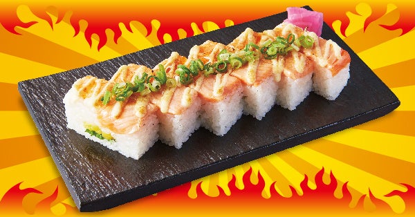 えびとサーモンを組み合わせた押し寿司に、マヨネーズをかけて炙ることで旨味が凝縮し美味しさ倍増♪刻みたくあんの食感と大葉の風味がアクセントになっています!