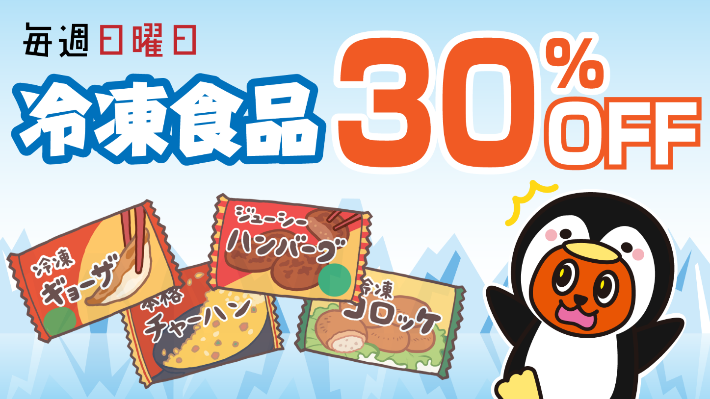 株式会社綿半フレッシュマーケット(本社:愛知県一宮市 代表取締役社⾧ 大原 弘嗣)は、地域のお客さまの生活を応援するため毎週日曜日に冷凍食品を全品30%割引きで販売いたします。