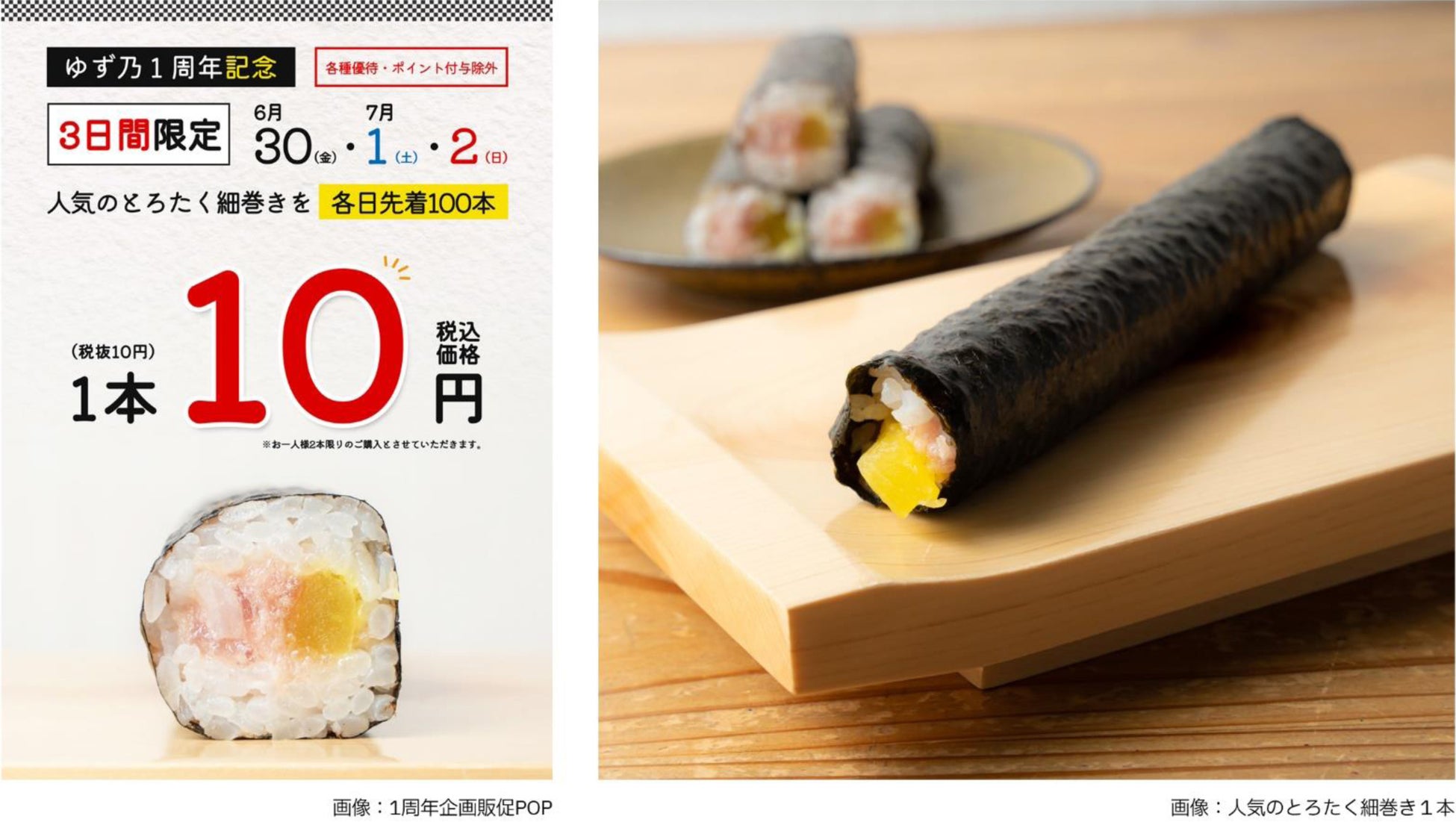 その中でも、旨味広がるマグロと程よい酸味の沢庵は、言わずと知れた相性ばっちりの寿司ネタです。そんな相性バッチのマグロと沢庵を、歯切れの良いこだわりの海苔でまいた人気の「とろたく細巻き」を、開催期間の3日間限定で、各日先着100本を、10円(税込)でご提供します。