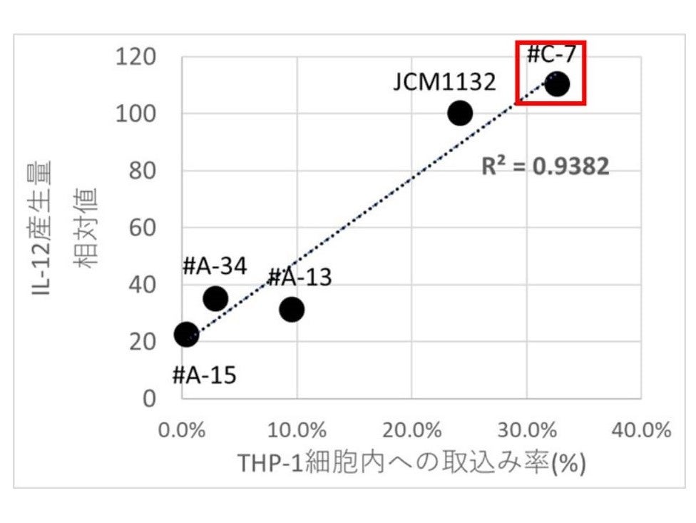 図5.乳酸菌のIL-12産生量及び免疫担当細胞への取り込み率の相関解析