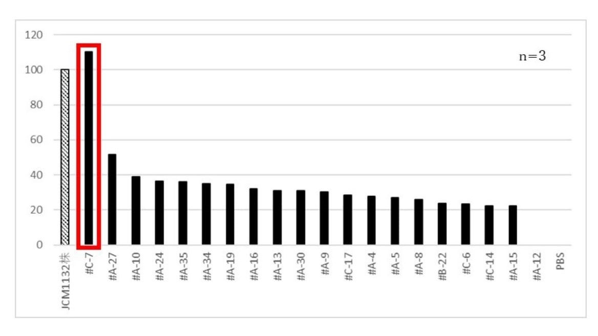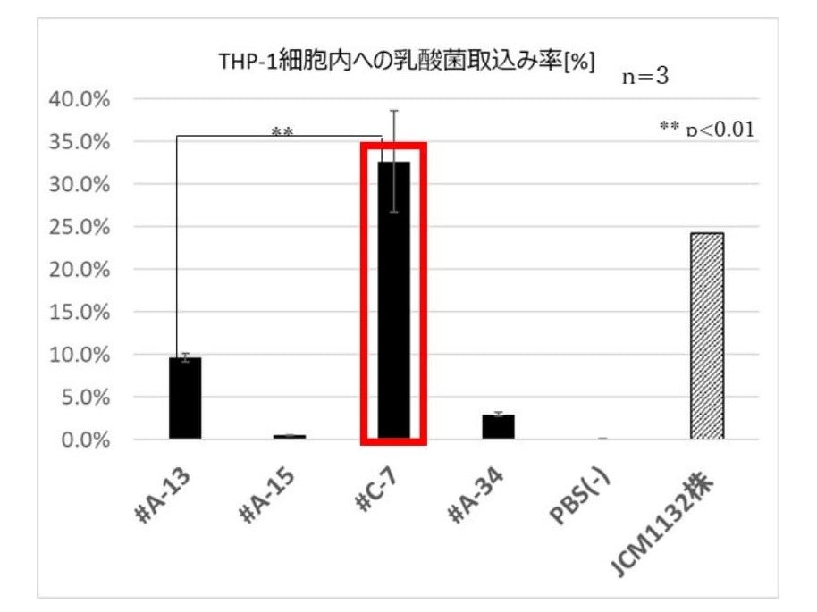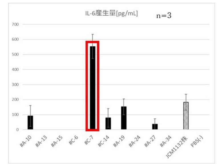 その結果、くず餅製造工程で単離同定された乳酸菌20種類のうち、Lactobacillus属の1種であるF1805株(試験内識別名:C-7株)は免疫系サイトカイン(IL-12、IL-6)の産生量、免疫担当細胞(THP-1細胞)への取り込み率などから高い免疫賦活効果が示唆されました。