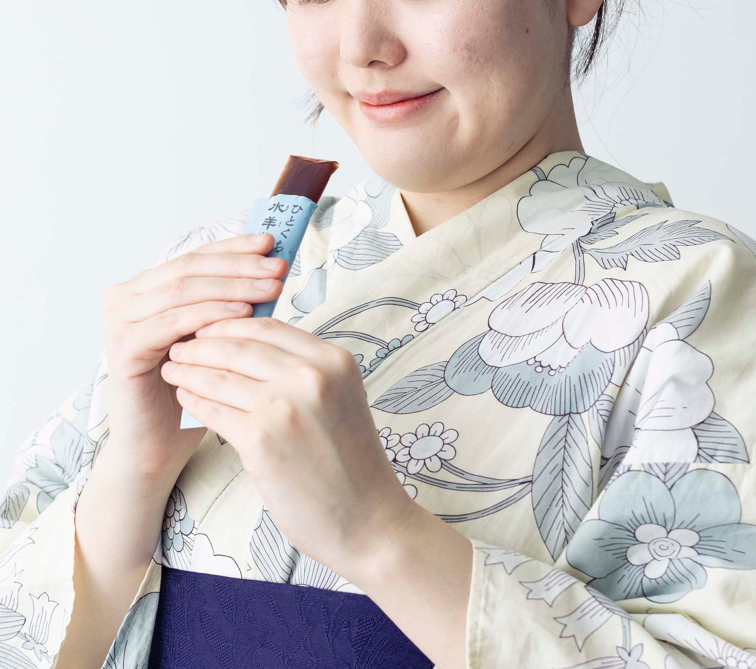 2023年初夏よりひとくち水羊羹を新発売。長年ご好評いただいている水羊羹をもっと手軽にお召しあがりいただけるよう、スティックタイプに仕立てました。