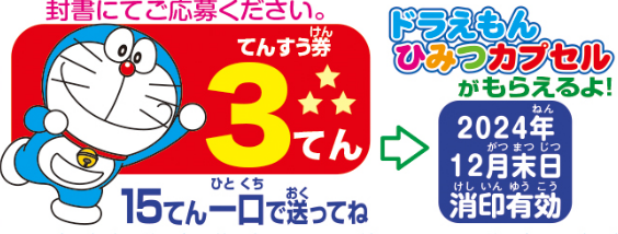 ドラえもんフーセンガムのてんすう券を15点分集めて応募すると、お店では買えない「ドラえもん ひみつカプセル」がもれなくもらえるプレゼント企画も継続実施中。