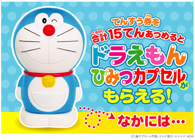 てんすう券を15点分集めると、ここでしか手に入らない貴重な「ドラえもんひみつカプセル」がもれなくもらえます。 ※てんすう券は、はずれの場合もございます。ご了承ください。