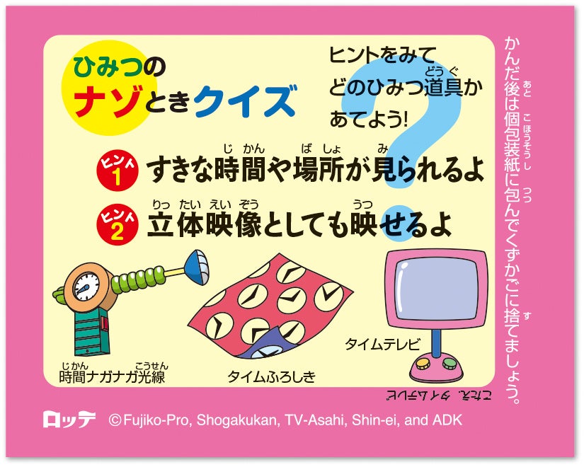 今回からパッケージの内装紙で展開している包み紙企画の内容をすべて変更。楽しみながら考える力を育む36種類(「てんすう券」を含めて40種類)を一新。てんすう券を15点分集めると必ずもらえる「ドラえもんひみつカプセル」企画は好評につき継続いたします。