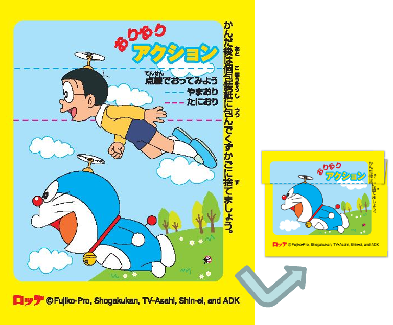 包み紙にはドラえもんの楽しい企画が36種類(「てんすう券」を含めて40種類)。