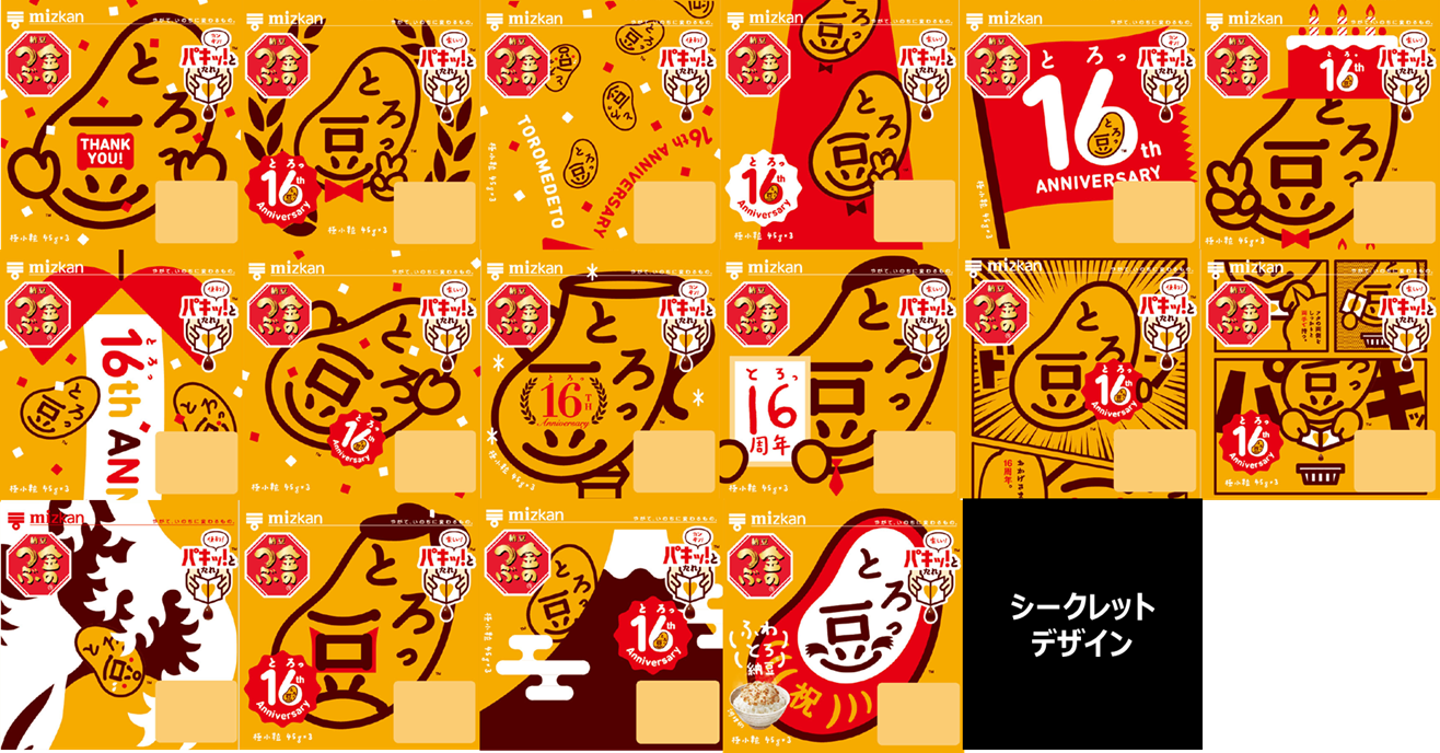 16(とろっ)周年と歴代パッケージ300種類突破となった記念の年に、上記でご紹介した16種類に加え、売り場で探すのがもっと楽しくなるような仕掛けとして、17番目の「シークレットデザイン」パッケージもご用意いたしました。