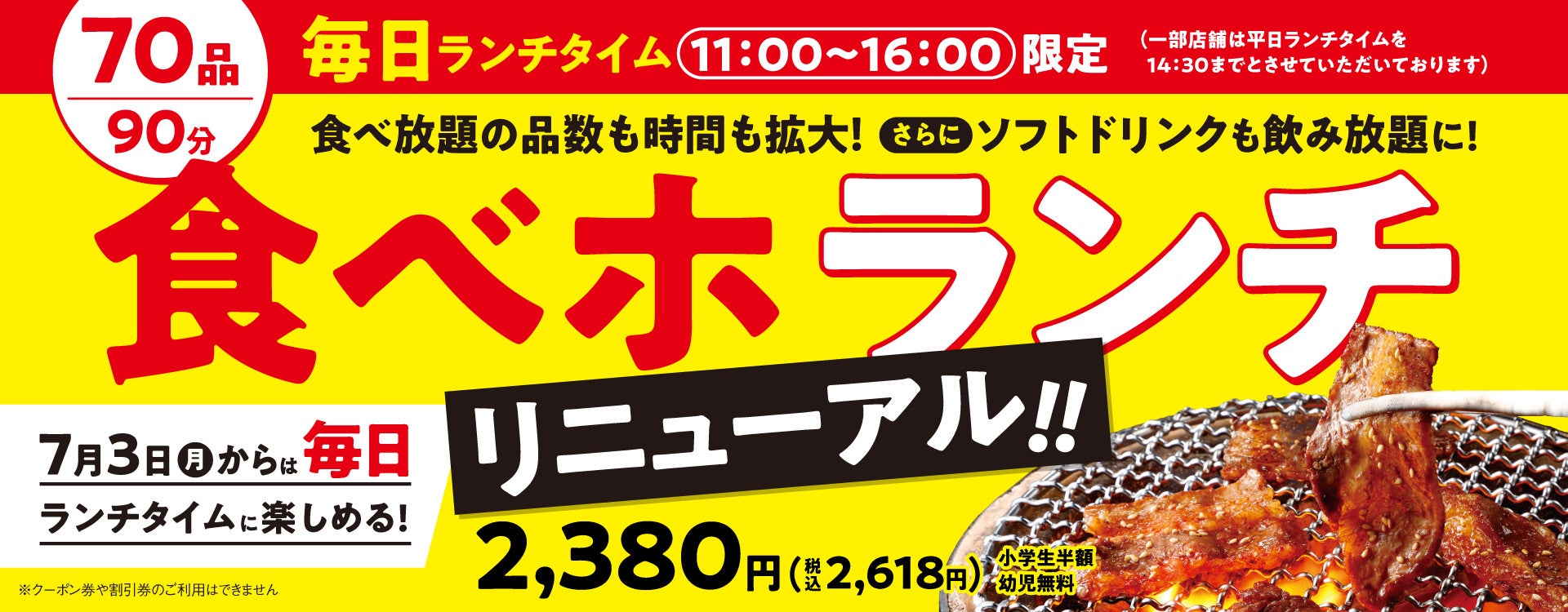 ◆対象商品・価格:焼肉食べ放題+ソフトドリンクバー飲み放題の70品90分をおひとり様2,380円(税込2,618円)※小学生半額1,190円(税込1,309円)/幼児無料 ※クーポン券や割引券は併用不可とさせていただきます