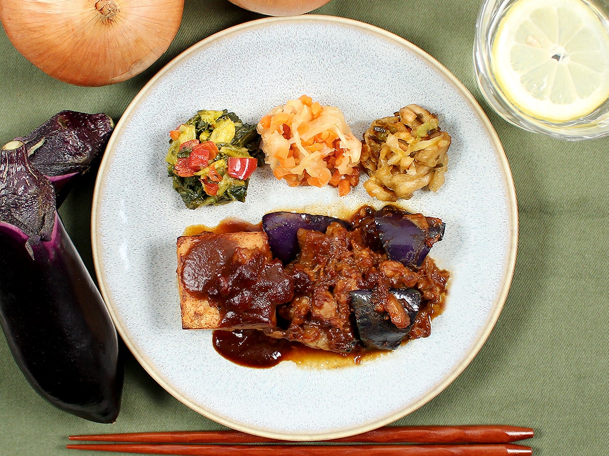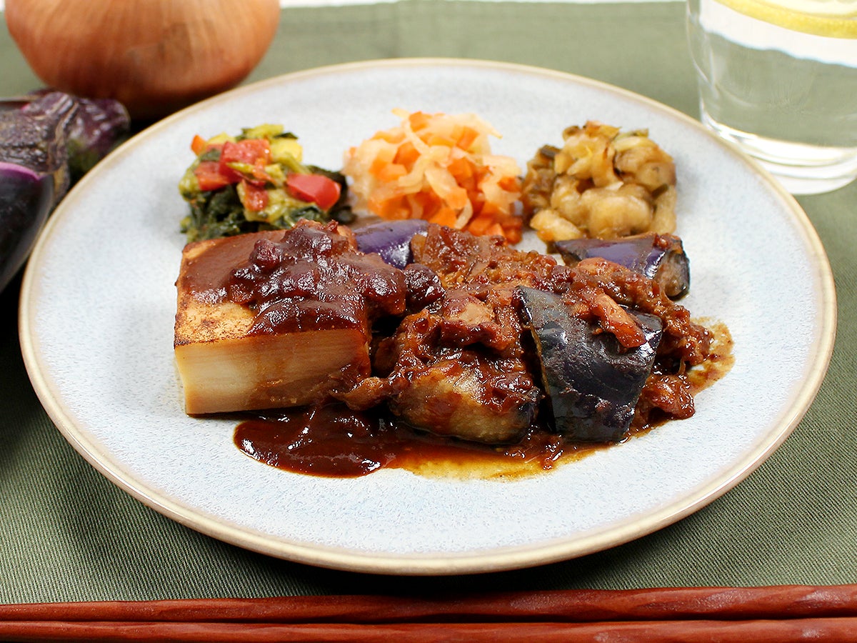長期熟成された旨味とコクが特徴の赤味噌を使用した揚げ茄子と焼き豆腐の鴨味噌です。大豆と米を原料とした無塩の味噌パウダーで塩分に配慮し、茄子と豆腐、スライスしたかぶのヘルシーな具材で仕上げました。赤味噌だれとあわせてお召し上がりください。